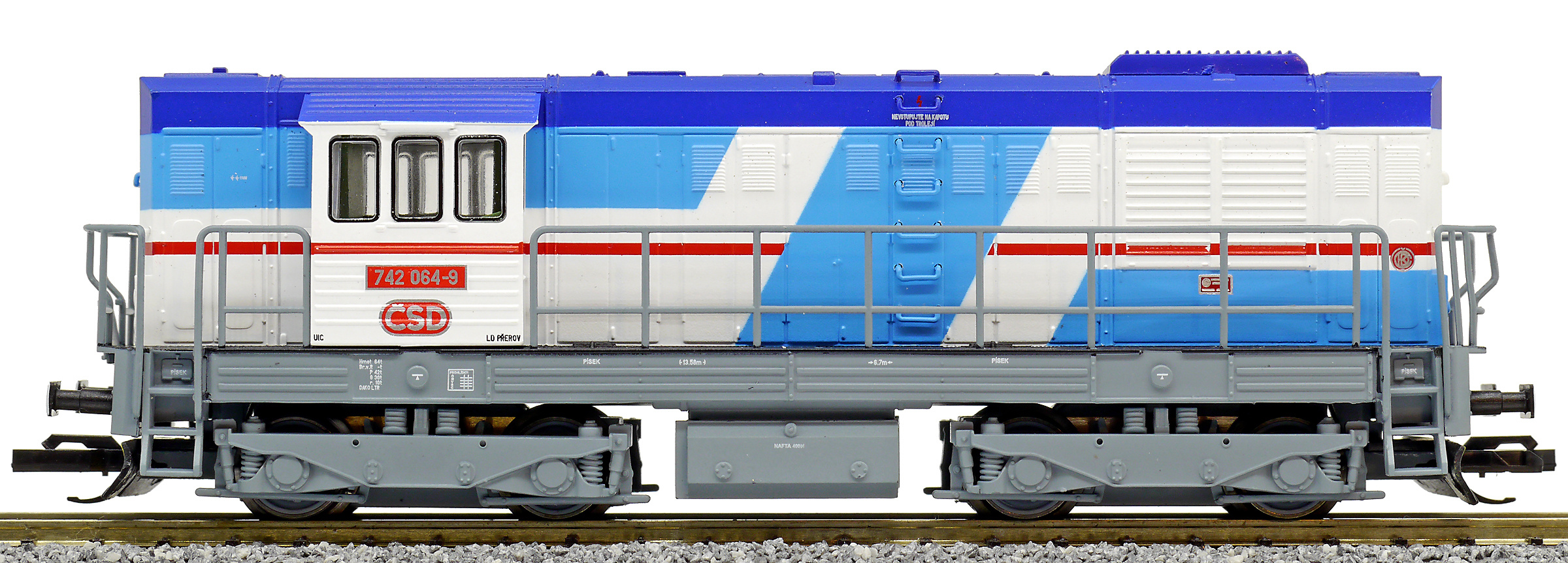 | dieselová lokomotiva modrá-bílá, šedý rám |