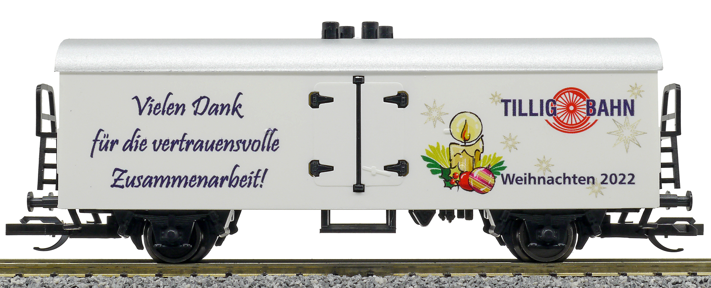 | chladící vůz bílý s šedou střechou a s reklamním potiskem „Weinachten 2022“ |