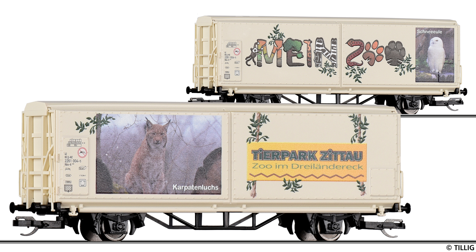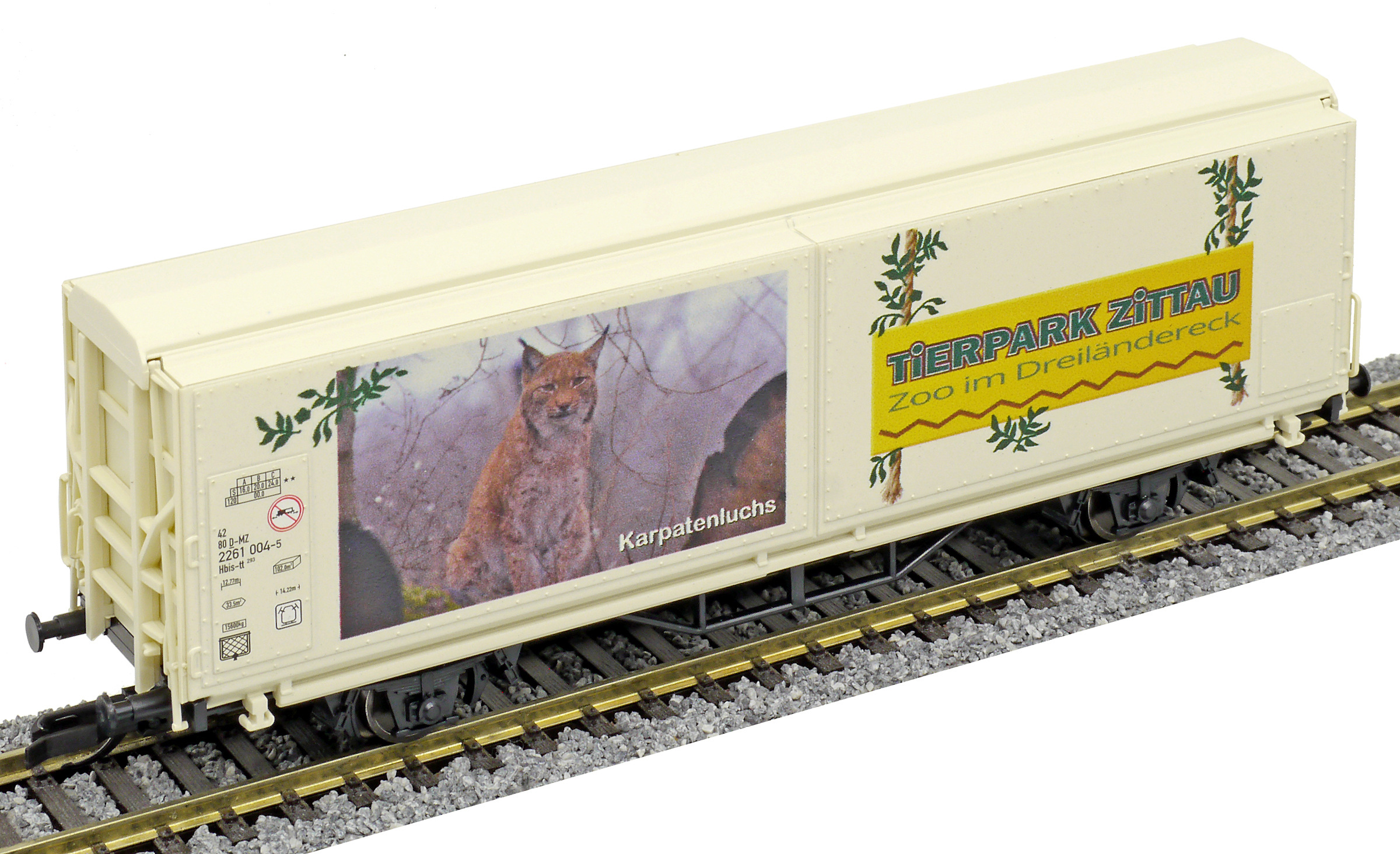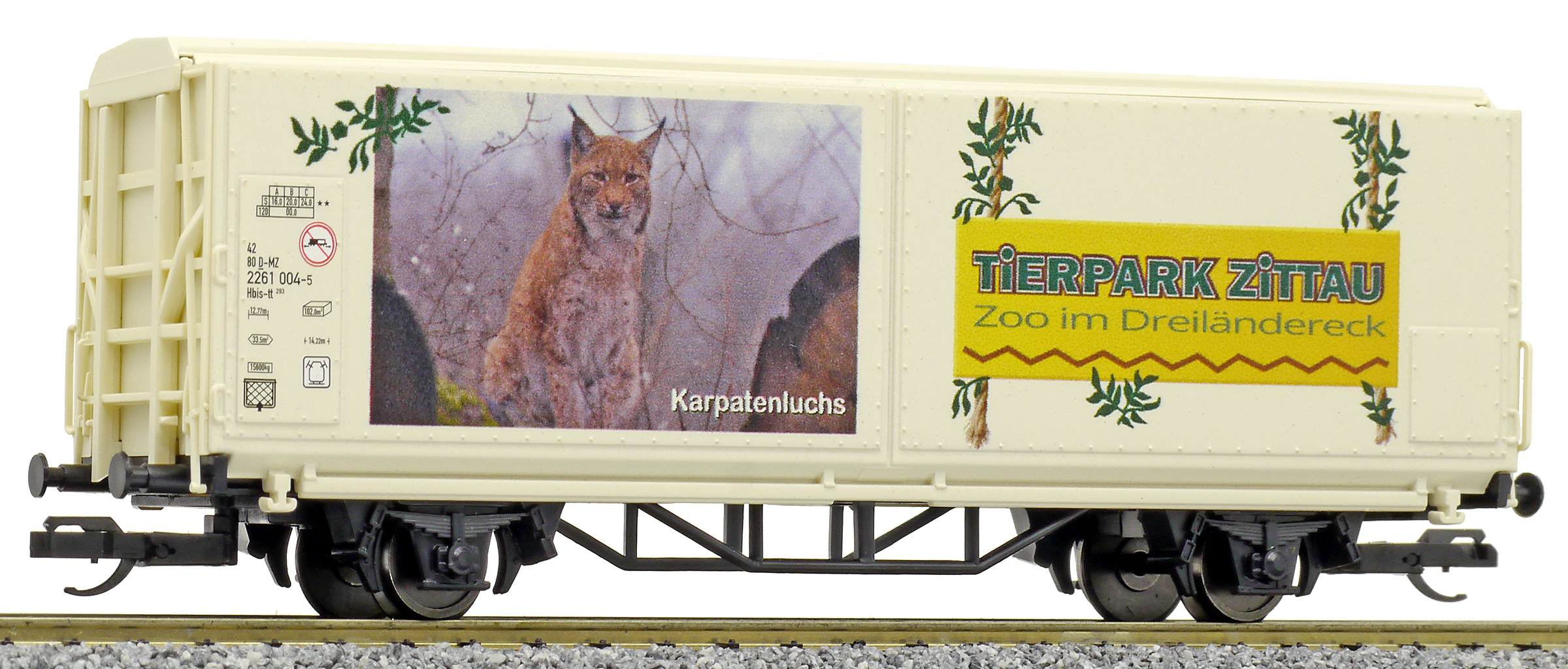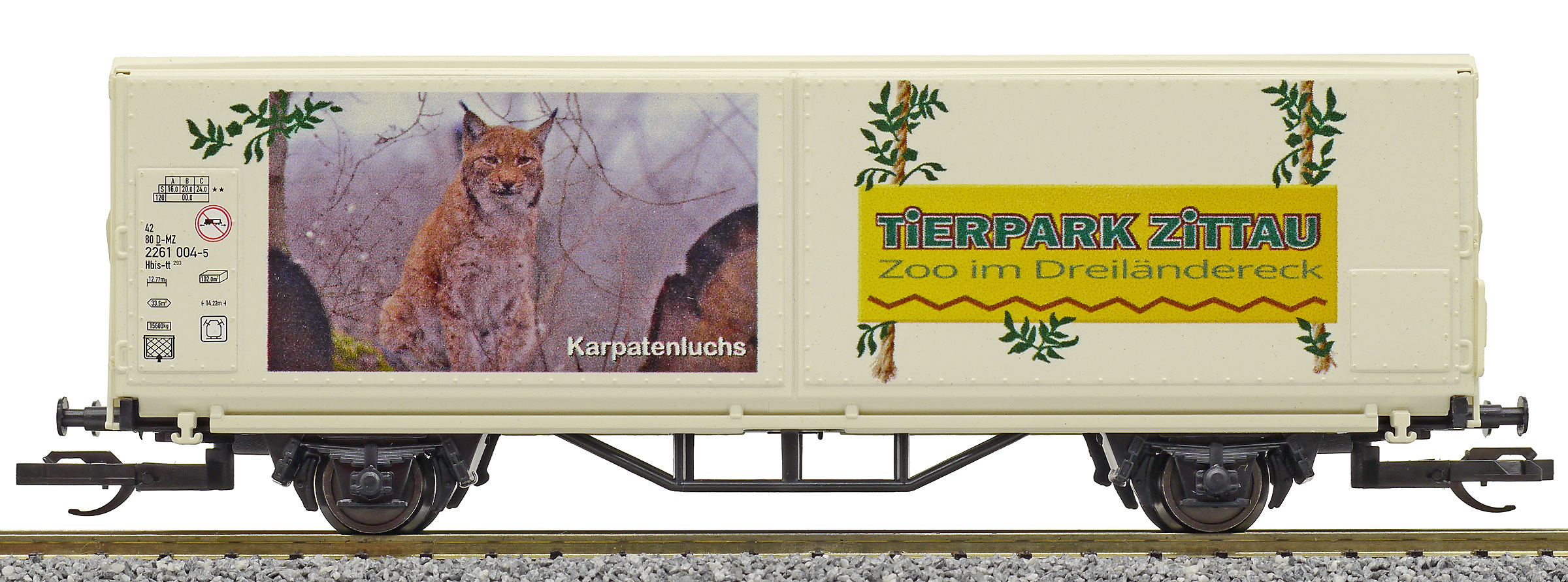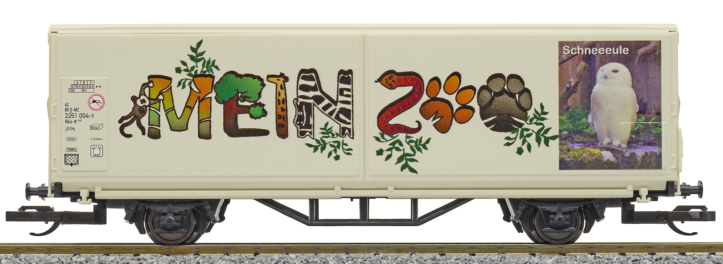 | krytý nákladní vůz s posuvnými stěnami a s reklamním potiskem „Mein Zoo” |