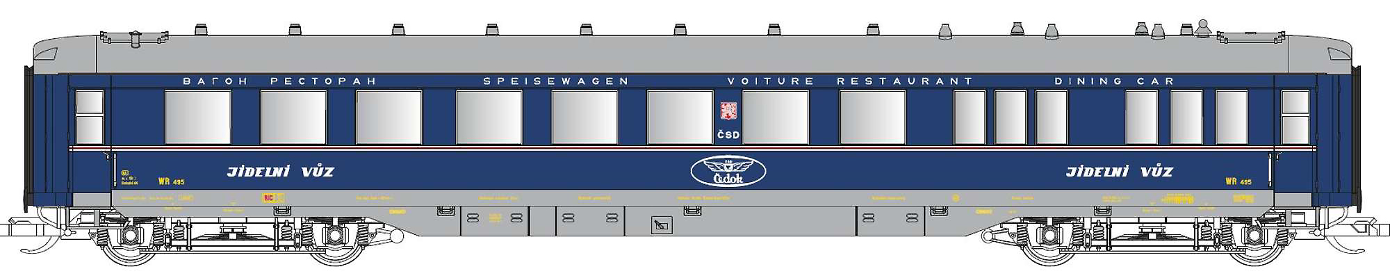 | jídelní vůz modrý s šedou střechou s logem „ČEDOK“ |