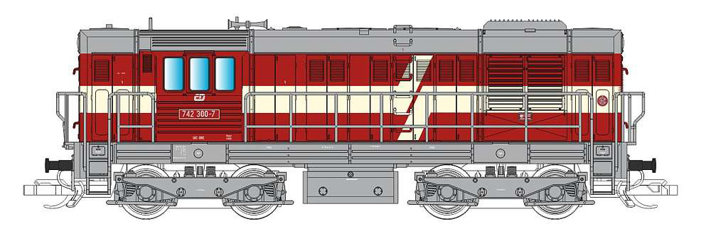 | dieselová lokomotiva červená s krémovým lomeným pásem, šedý pojezd a střecha |