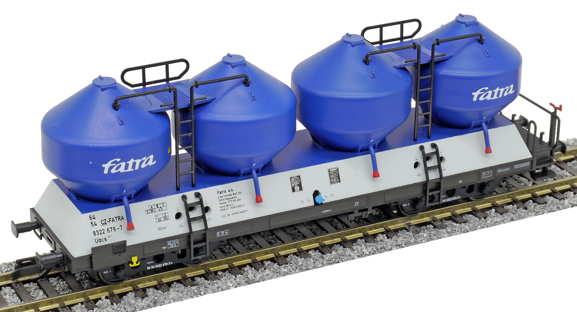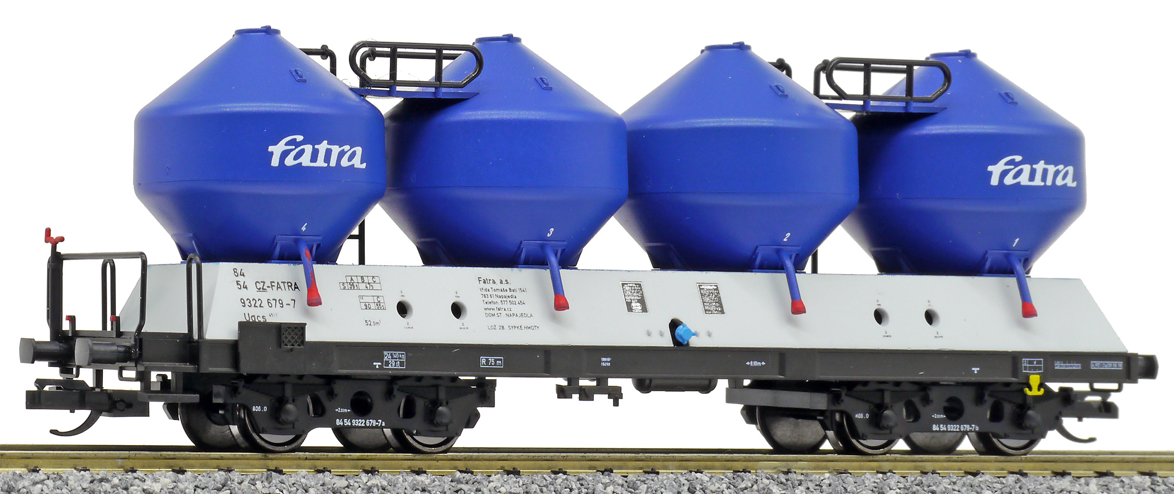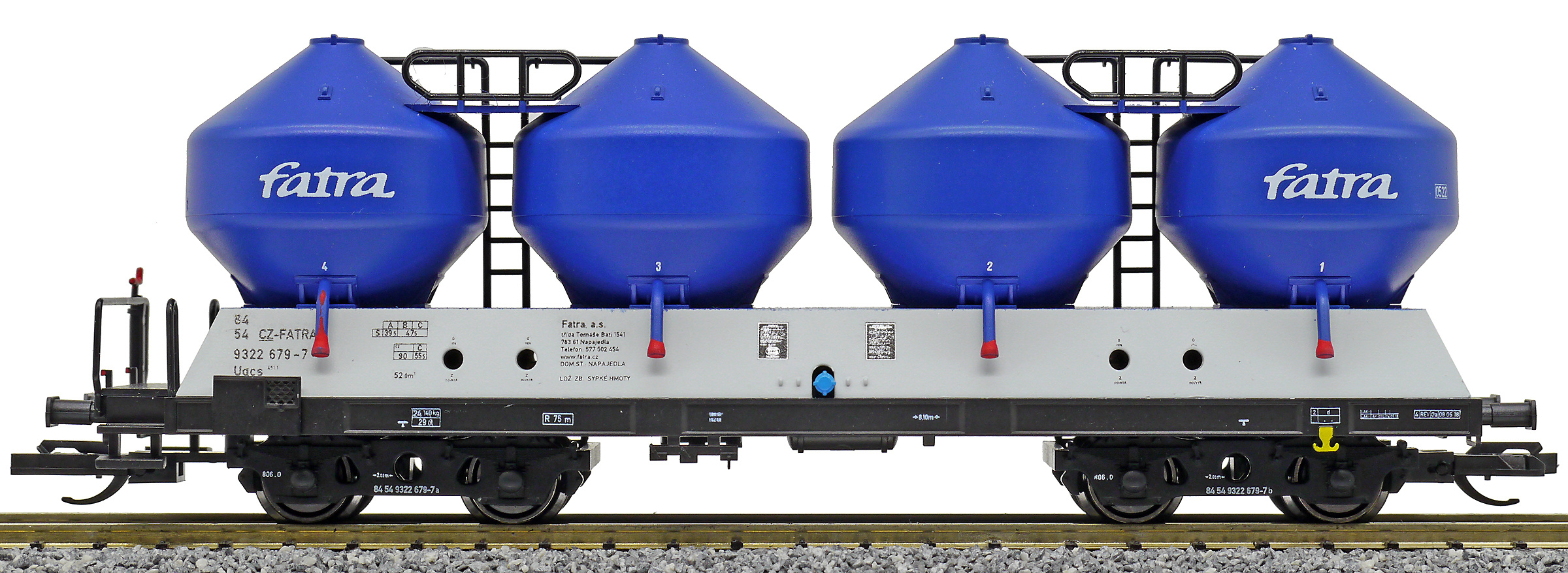 | nákladní samovýsypný vůz šedý-modrá skříň s modrými nádobami a s logem „Fatra“ |