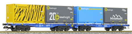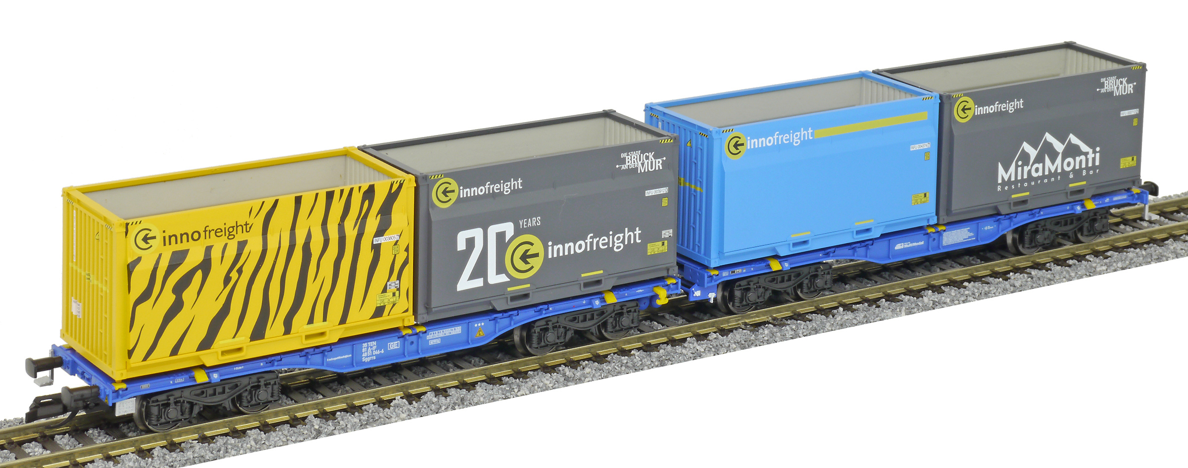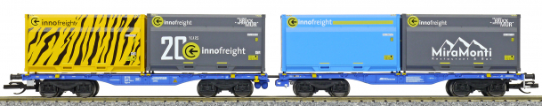 | dvojitý nákladní vůz InnoWaggon 2x40' s nákladem čtyř kontejnerů „WoodTainer“ |