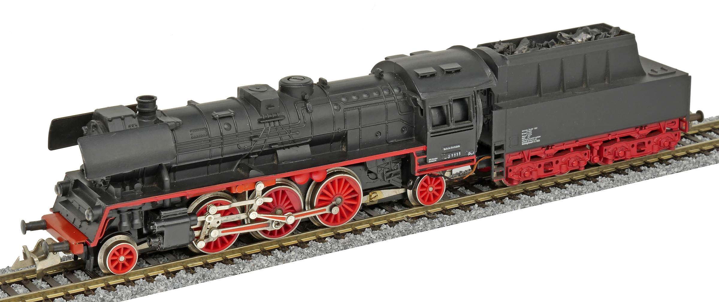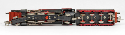 | parní lokomotiva černá s červenými koly a rozvodem, kouřové plechy |