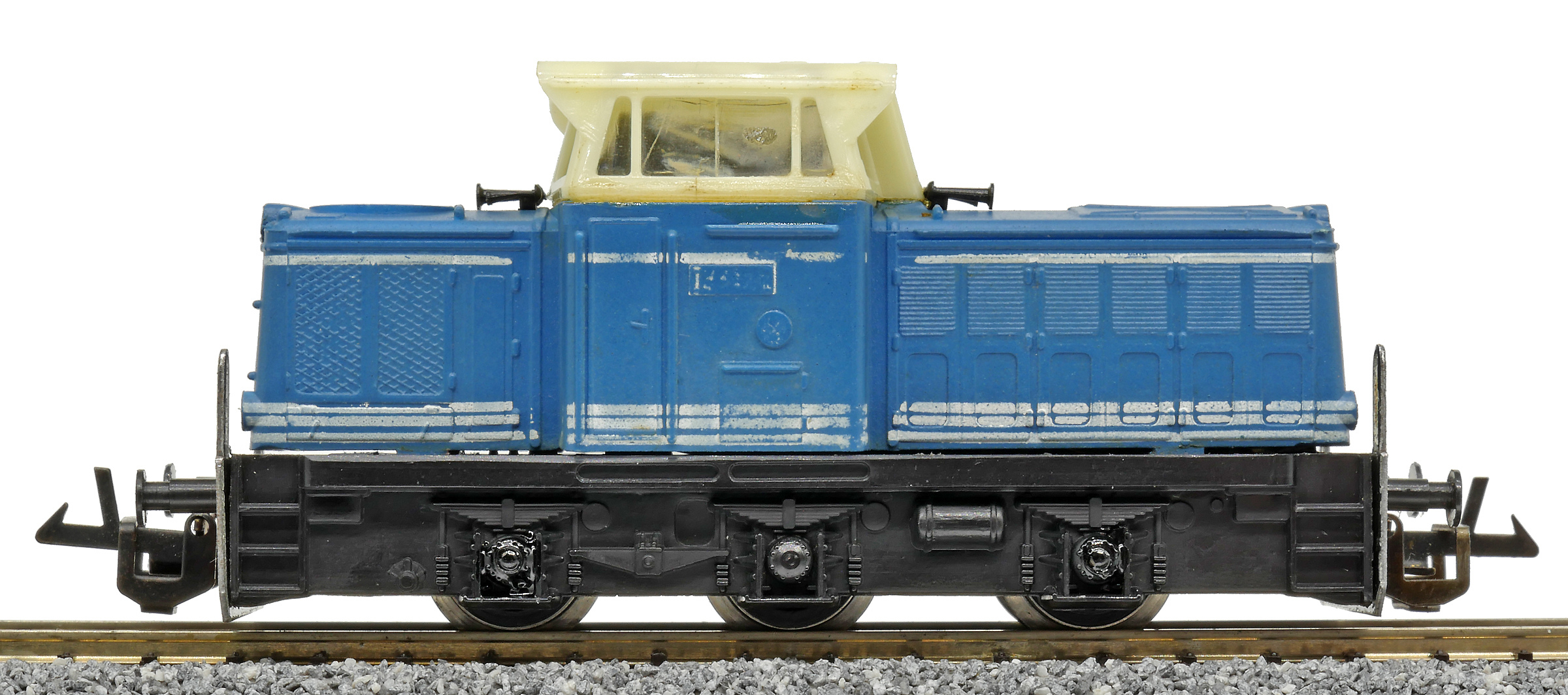 | dieselová lokomotiva modrá s bílými proužky, krémová budka, černý rám a pojezd |