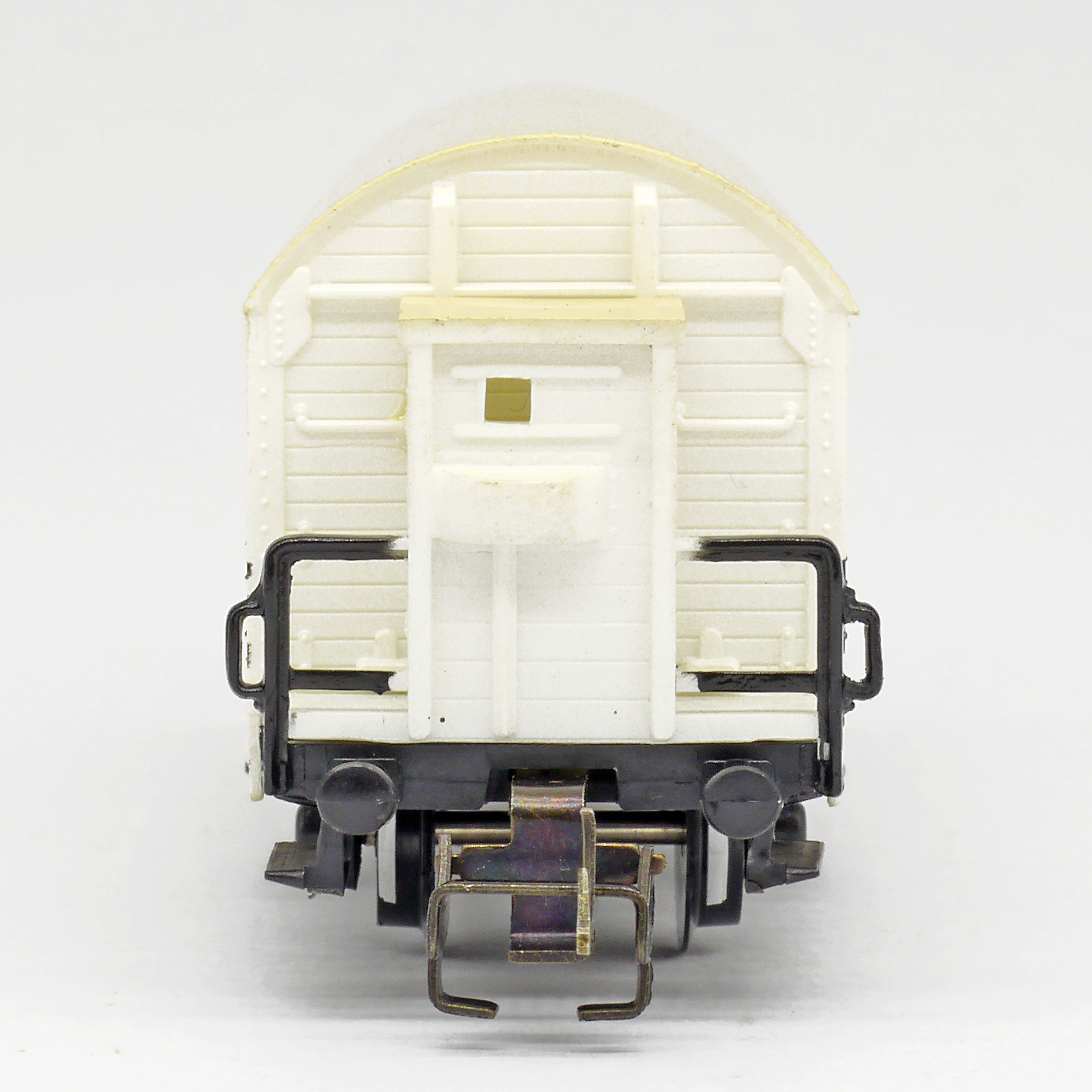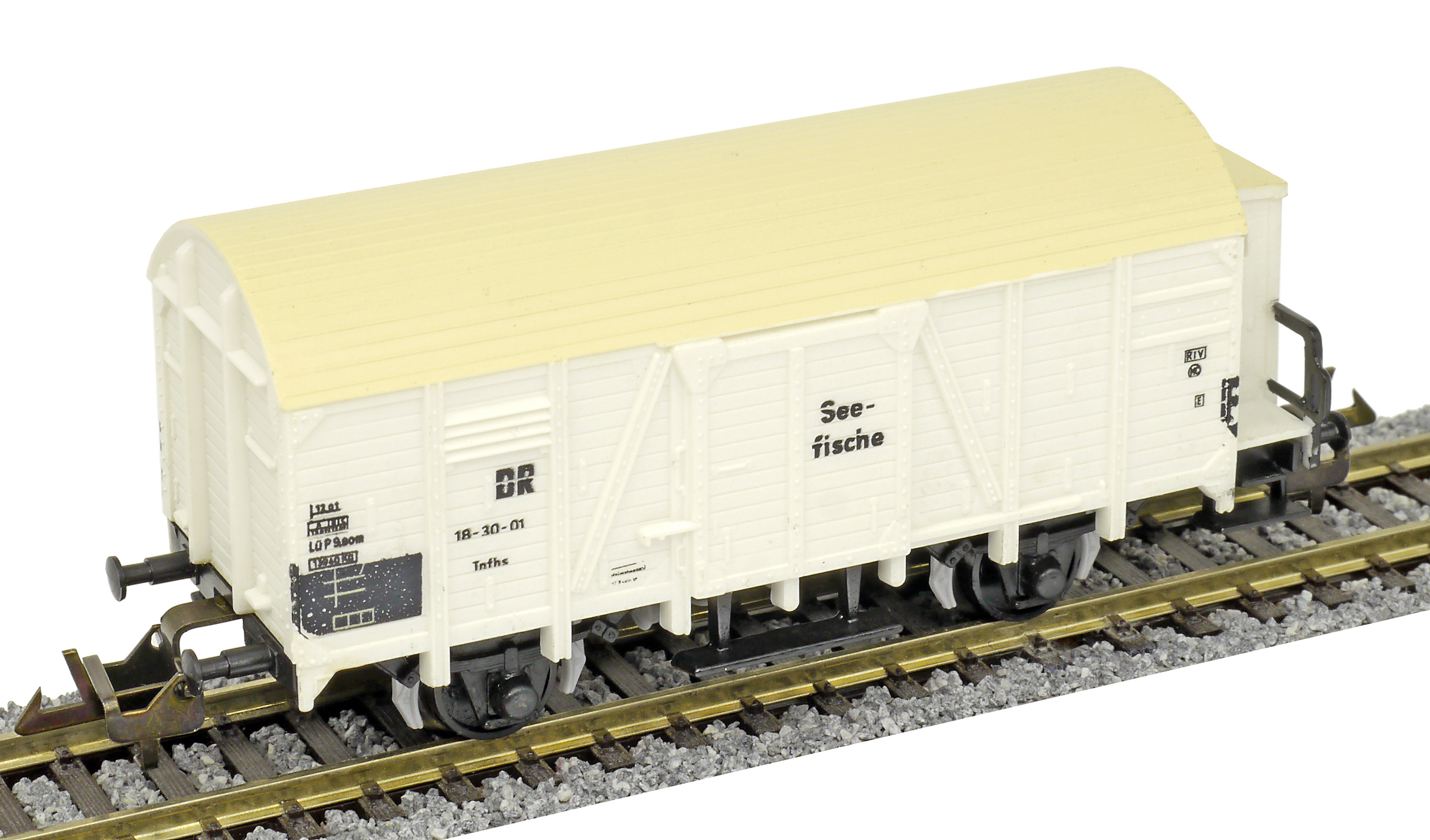nákladní chladící vůz bílý s krémovou střechou a s brzdařskou budkou na přepravu ryb „Seefische“