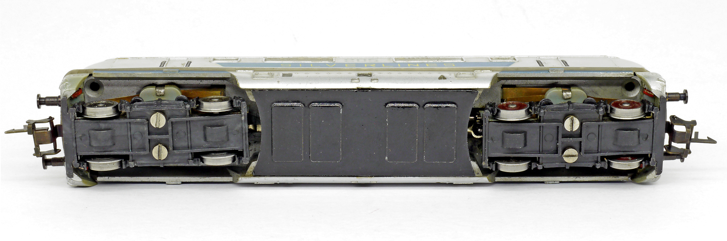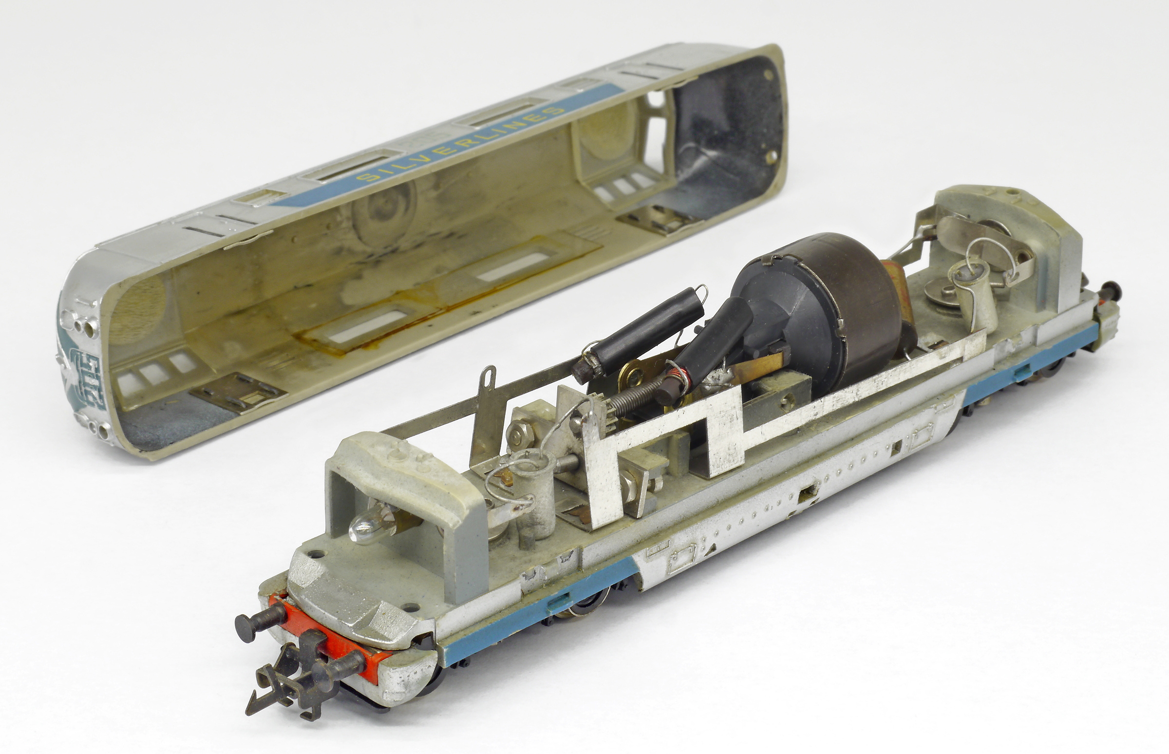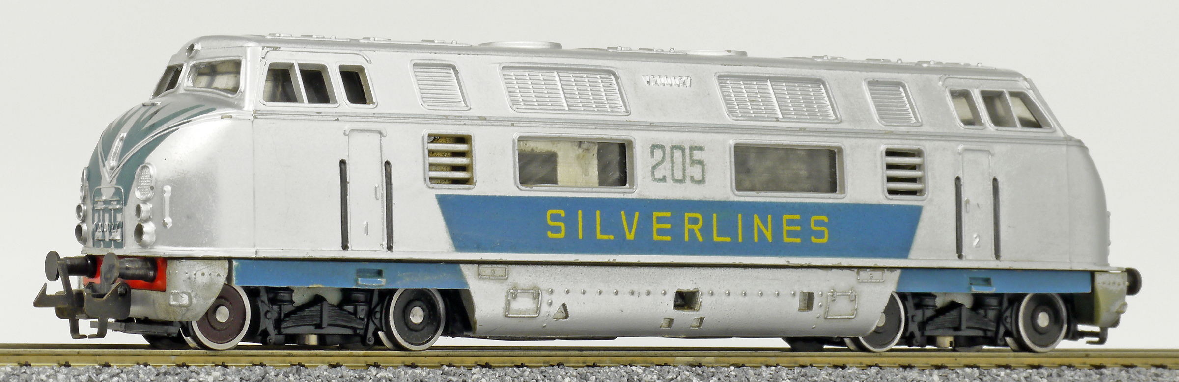 | dieselová lokomotiva v barevném schematu „SILVERLINES“ |
