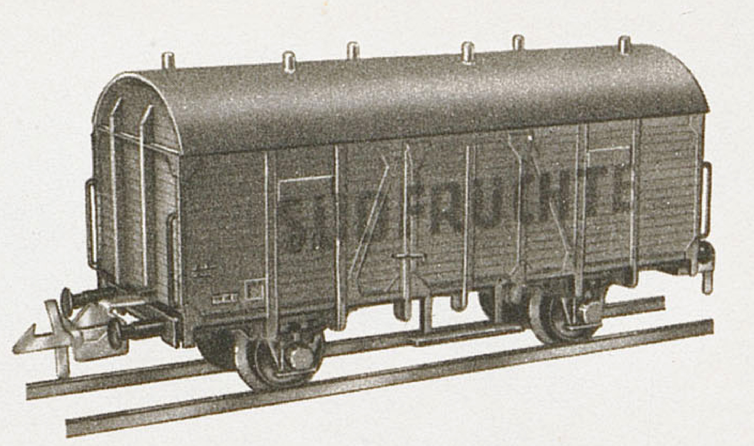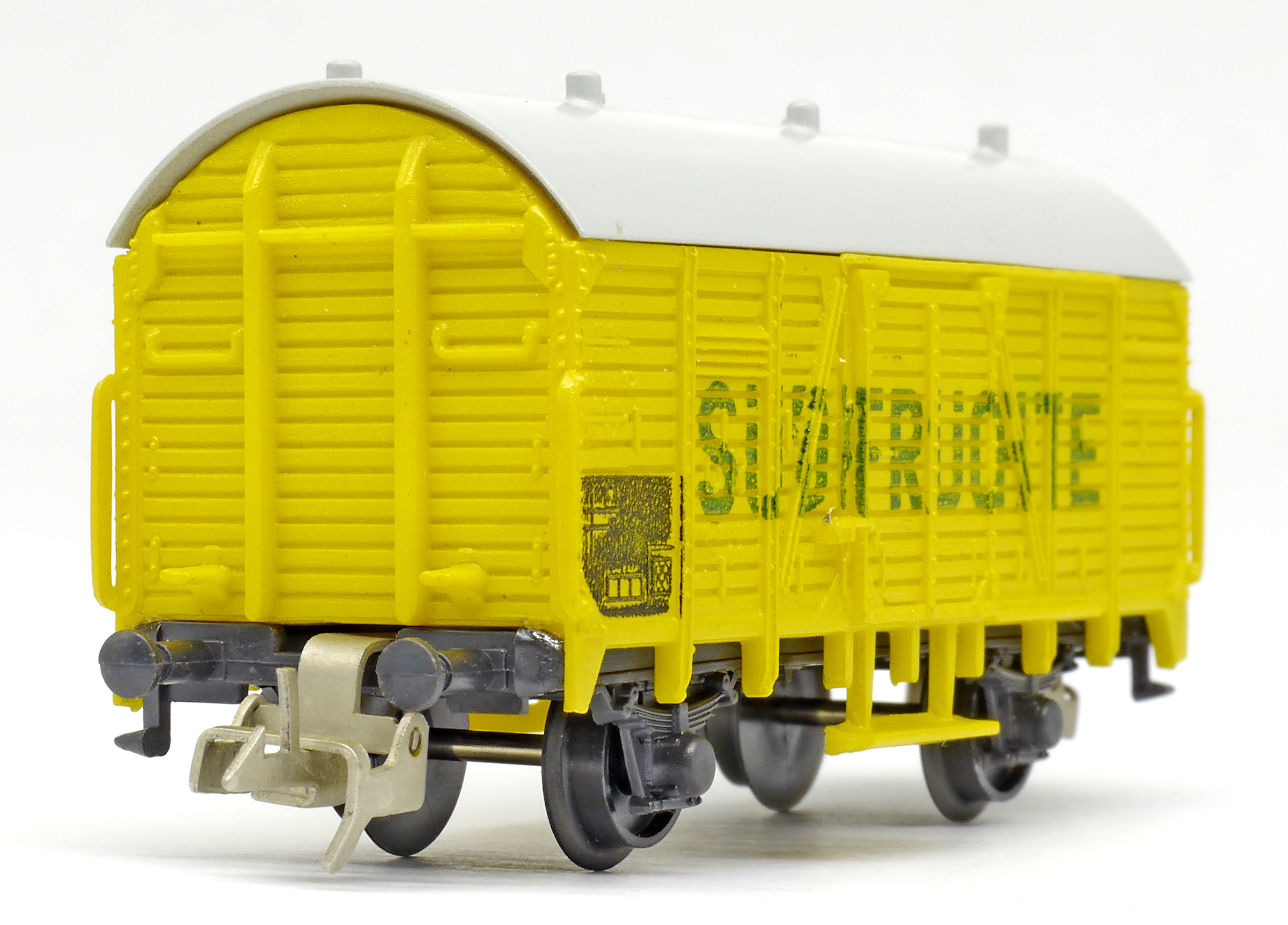| nákladní chladící vůz žlutý s šedou střechou „Südfrüchte“, bez brzd |