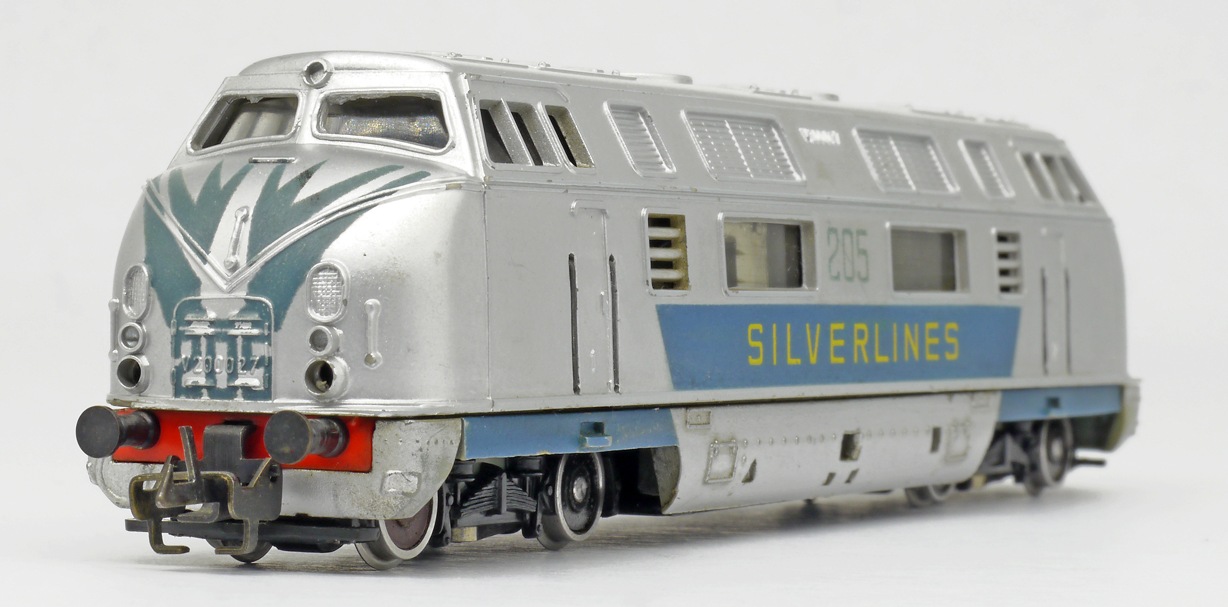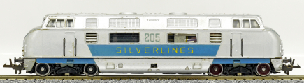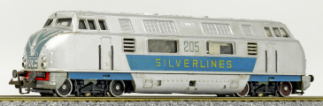 | dieselová lokomotiva v barevném schematu „SILVERLINES“ |