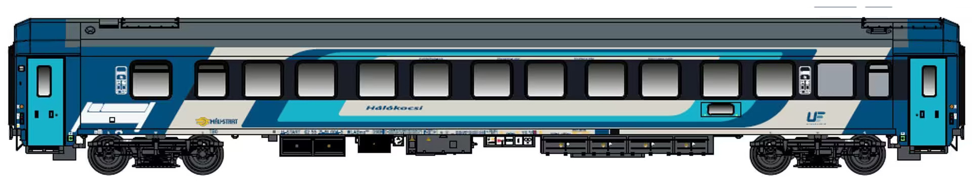 | lůžkový vůz v barevném motivu modré-šedé s šedou střechou |