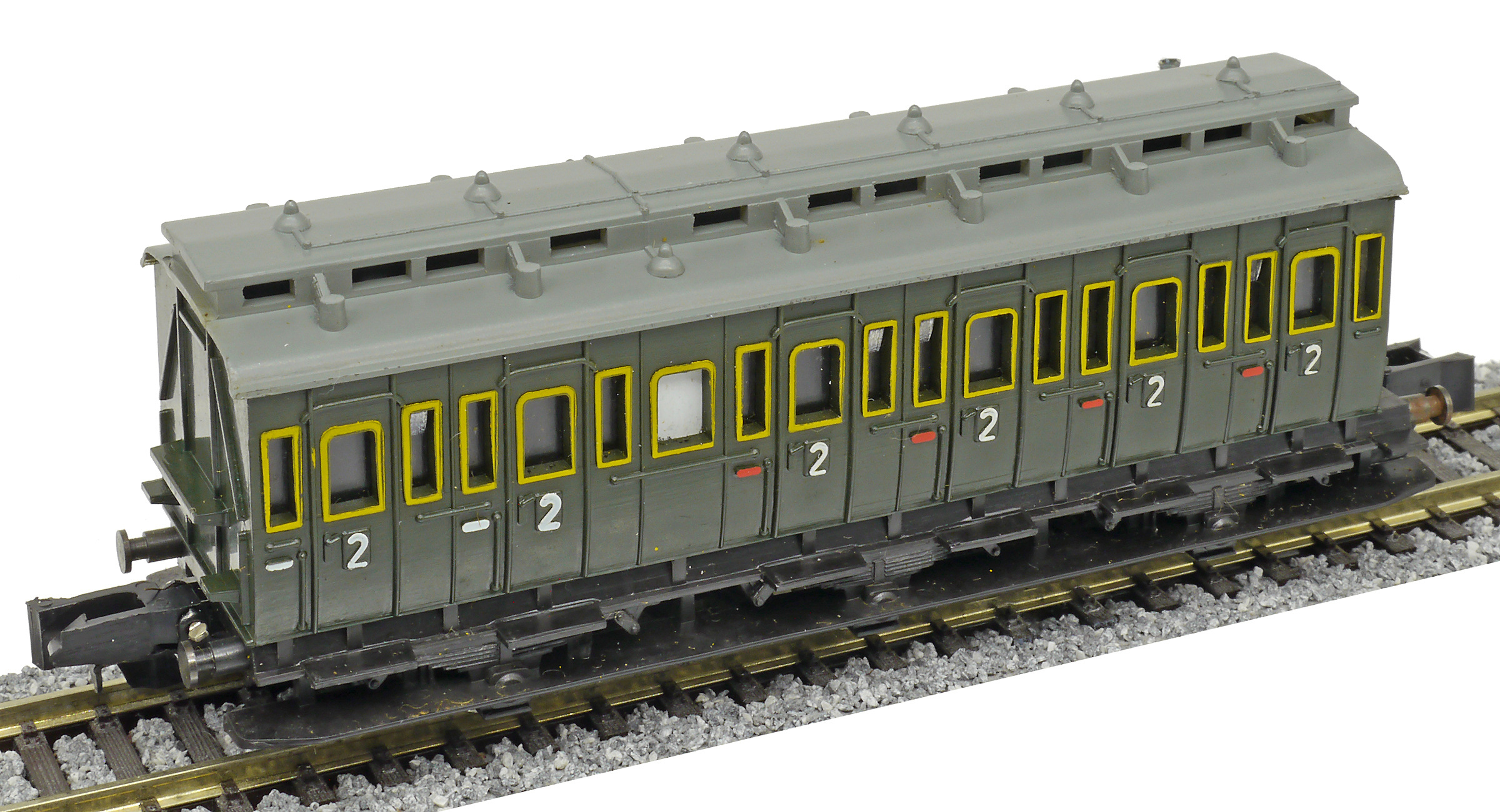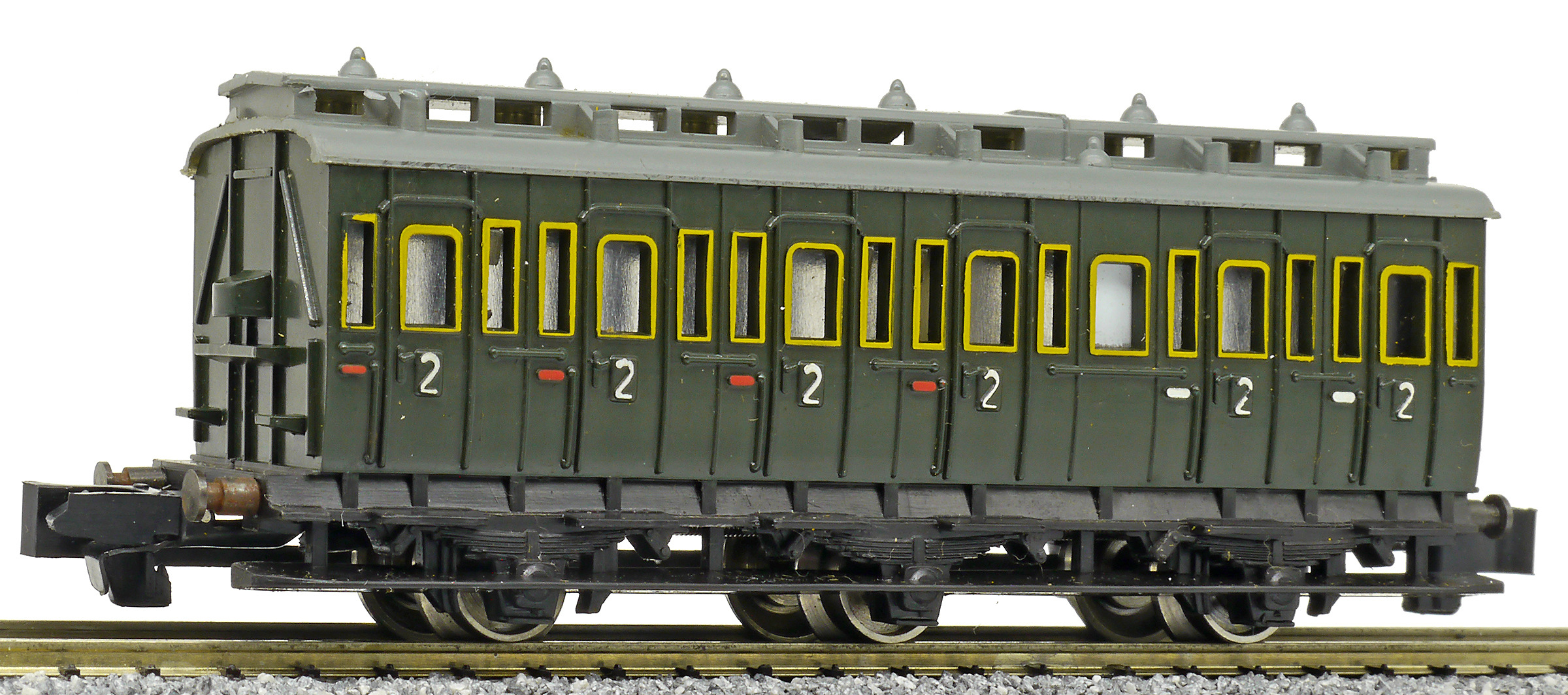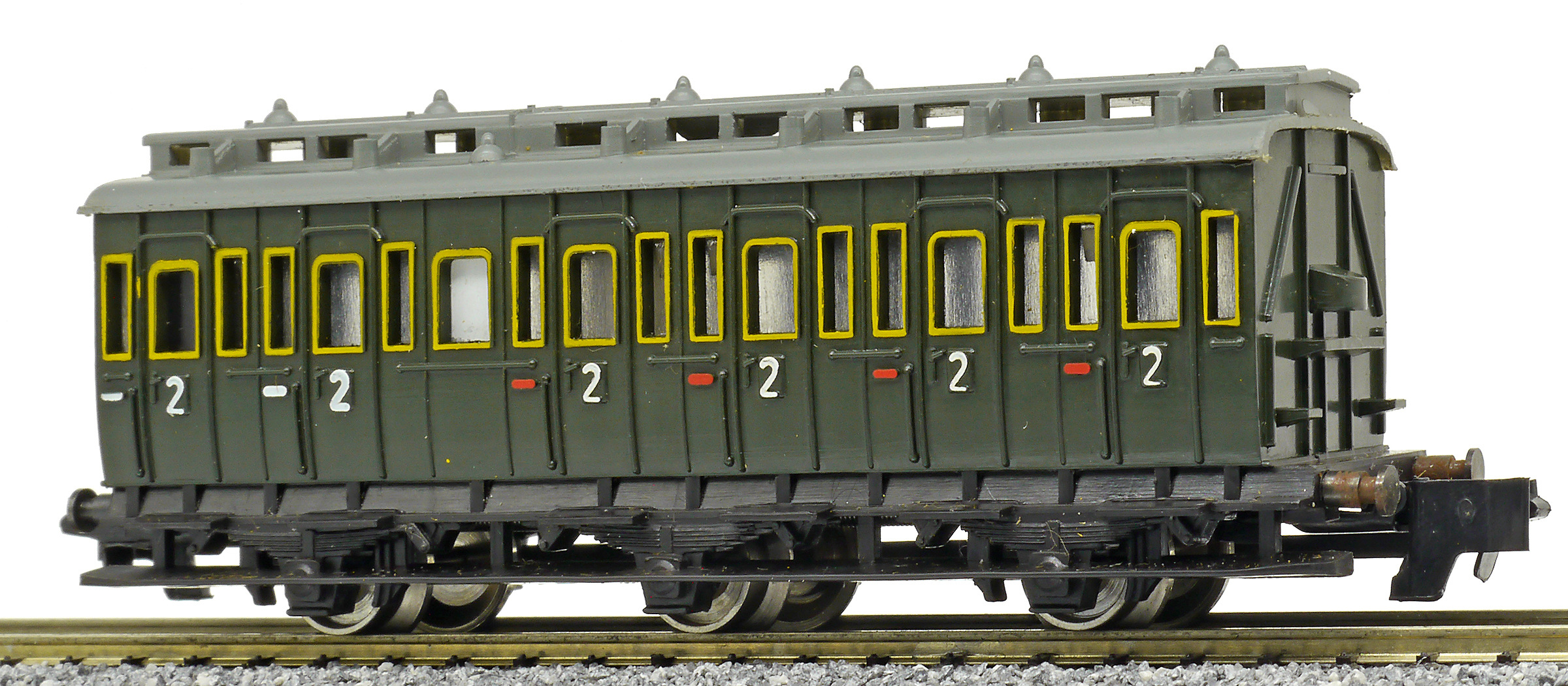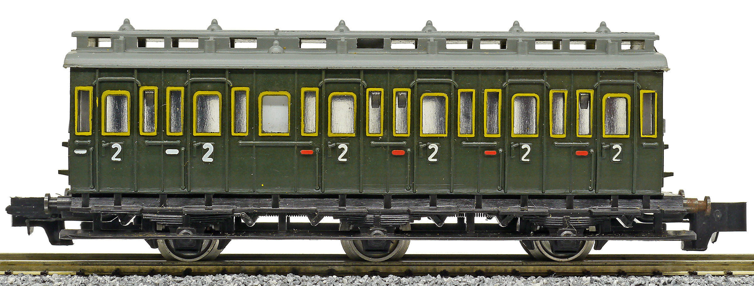 | oddílový osobní vůz zelený s šedou střechou 2. tř. |
