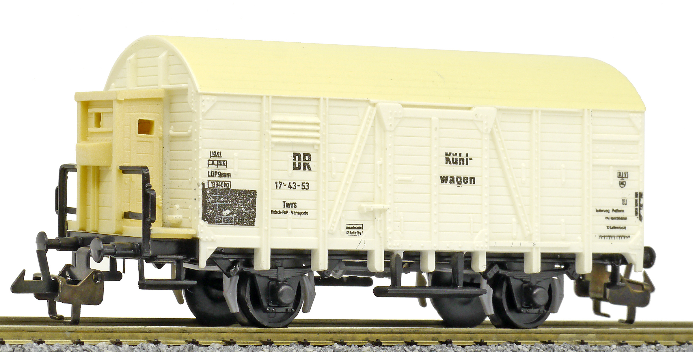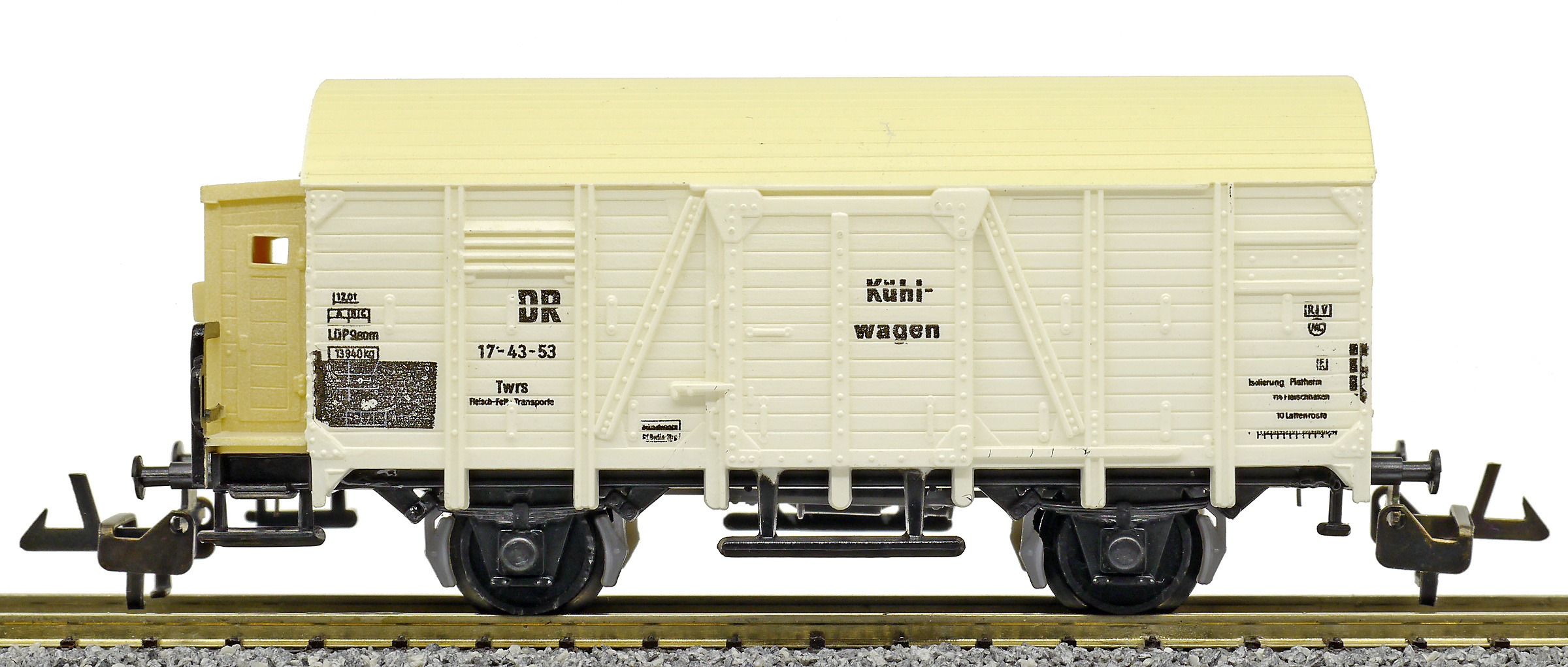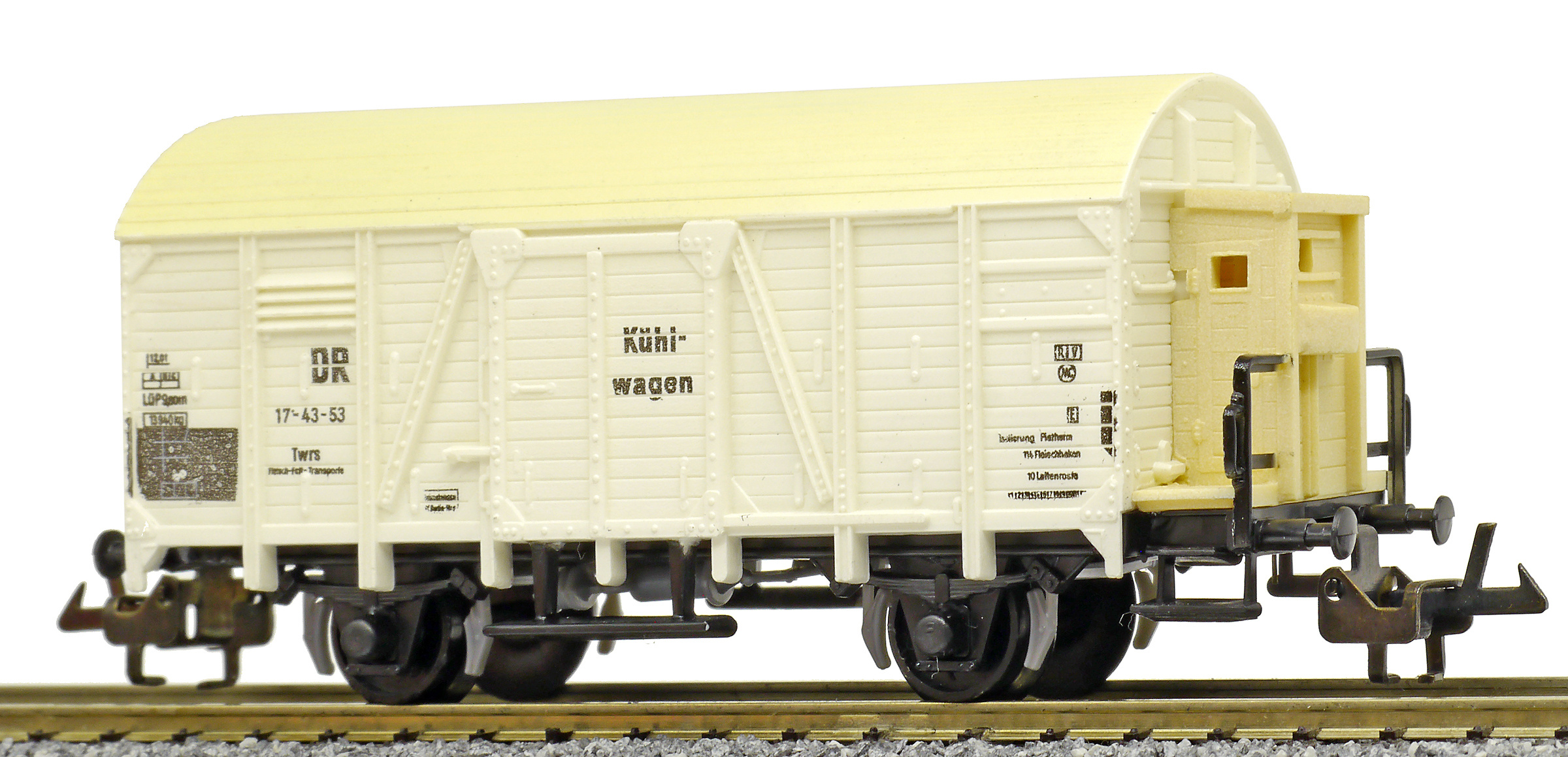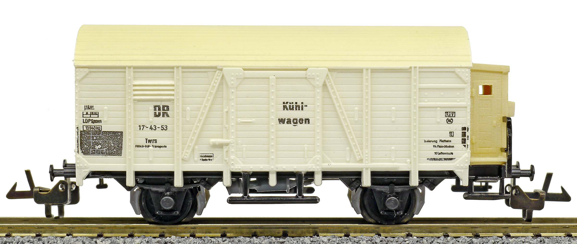 | nákladní chladící vůz bílý s krémovou střechou a s brzdařskou budkou „Kühlwagen“ |