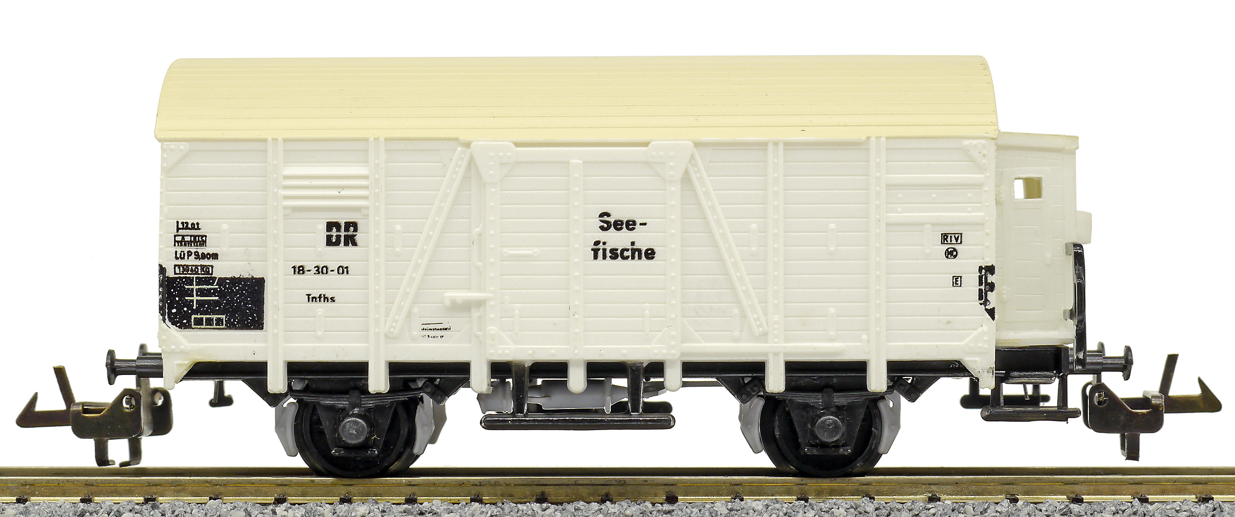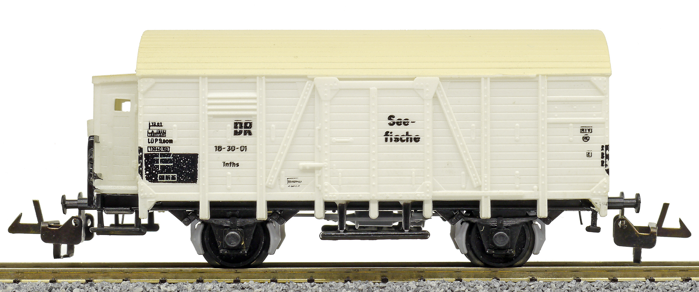 | nákladní chladící vůz bílý s krémovou střechou a s brzdařskou budkou na přepravu ryb „Seefische“ |