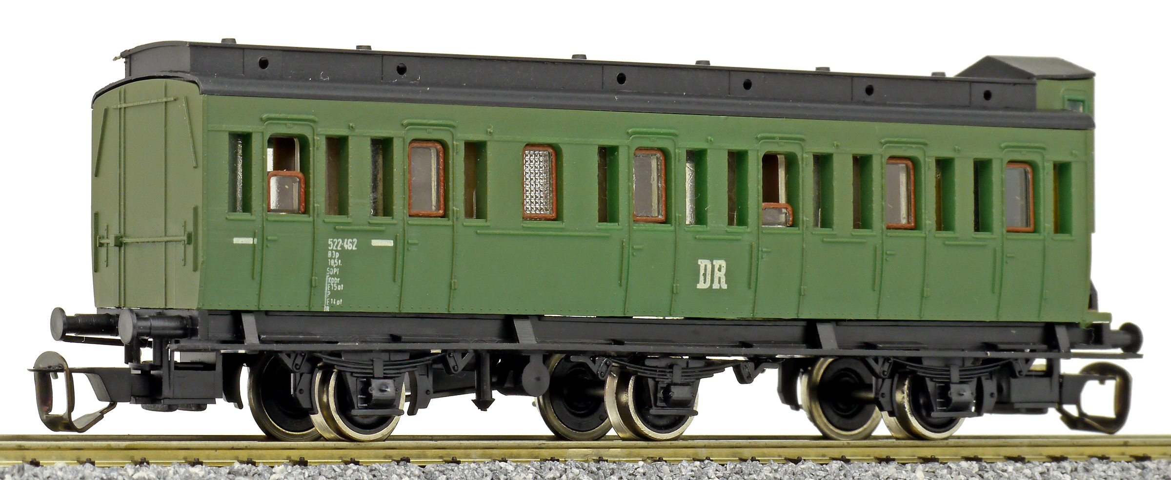 Popis   oddílový osobní vůz zelený s černou střechou a s brzdařskou budkou