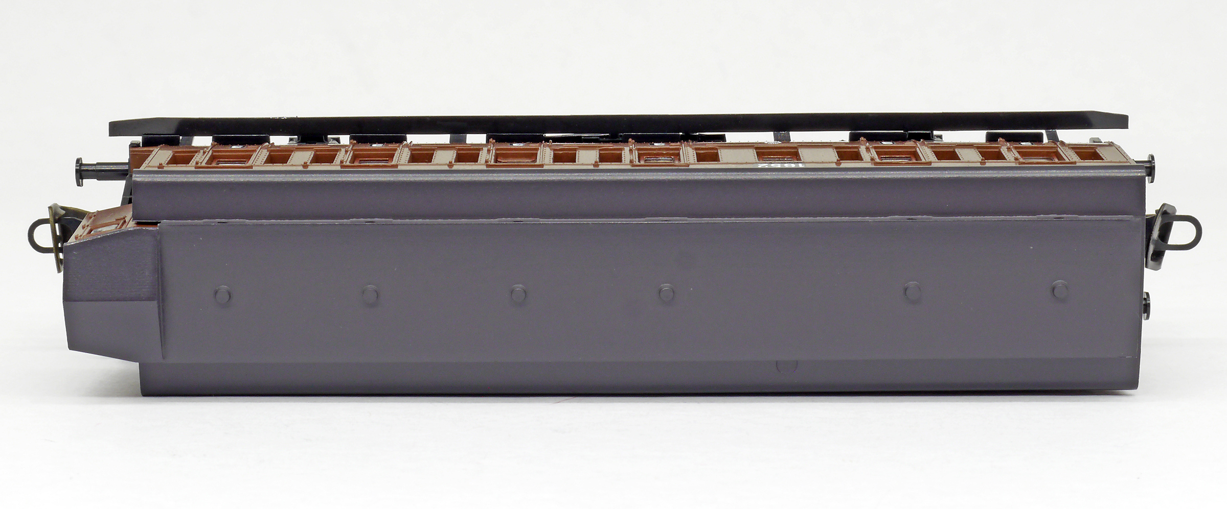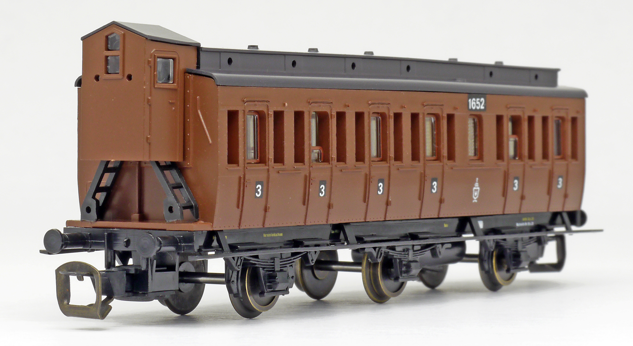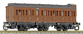 oddílový osobní vůz červený s černou střechou a s brzdařskou budkou 3. tř.