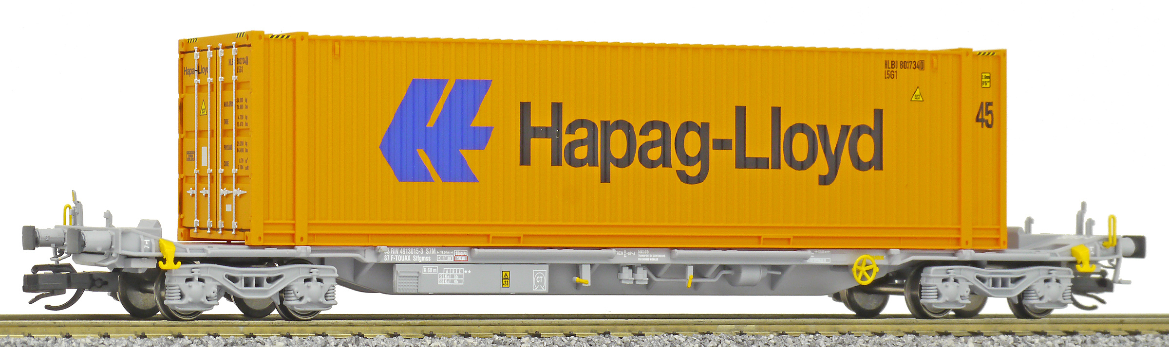 | kontejnerový vůz „IFA” šedý ložený 45' kontejnerem „Hapag-Lloyd” |