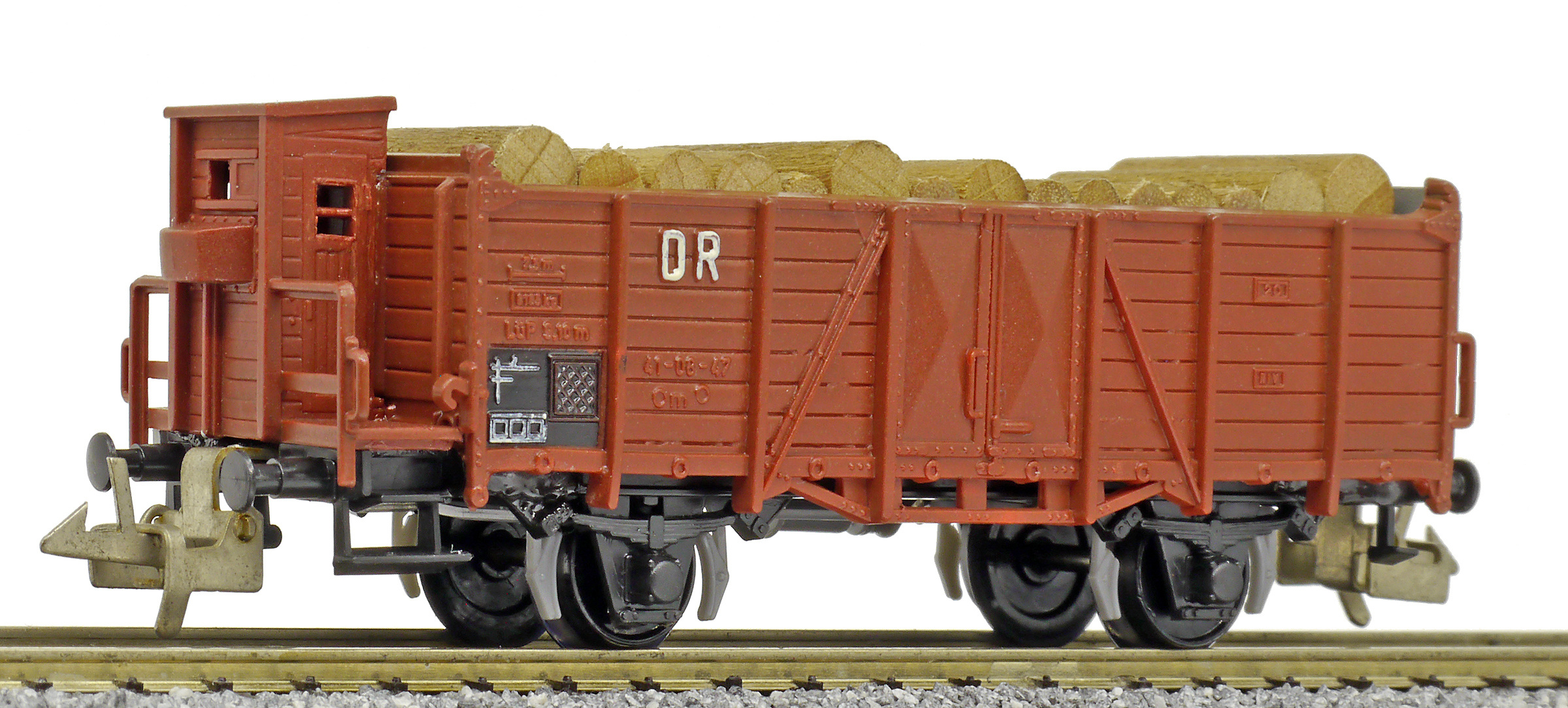 | otevřený nákladní vůz červenohnědý s brzdařskou budkou ložený kulatinou |