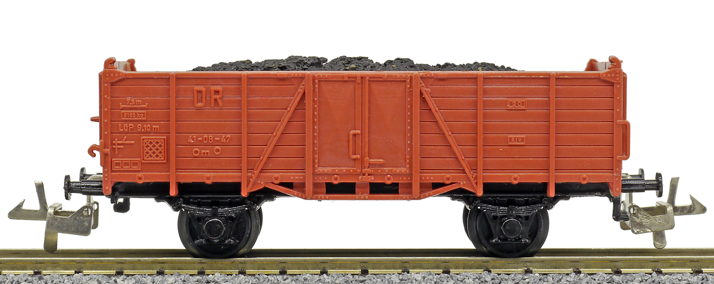 | otevřený nákladní vůz červenohnědý nebo zelený s nákladem uhlí |