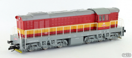| dieselová lokomotiva červená s výstražným pruhem, šedá střecha, rám a pojezd |