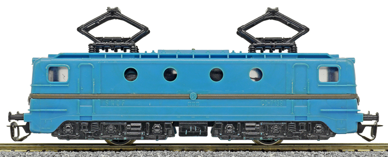 | elektrická lokomotiva, různé barvy plastu, černé plastové pantografy a černá imitace pojezdu |