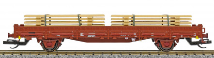 | nízkostěnný nákladní vůz červenohnědý s klanicemi s nákladem stohů desek |