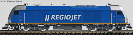 | dieselová lokomotiva modrá-stříbrná „Regiojet“ |