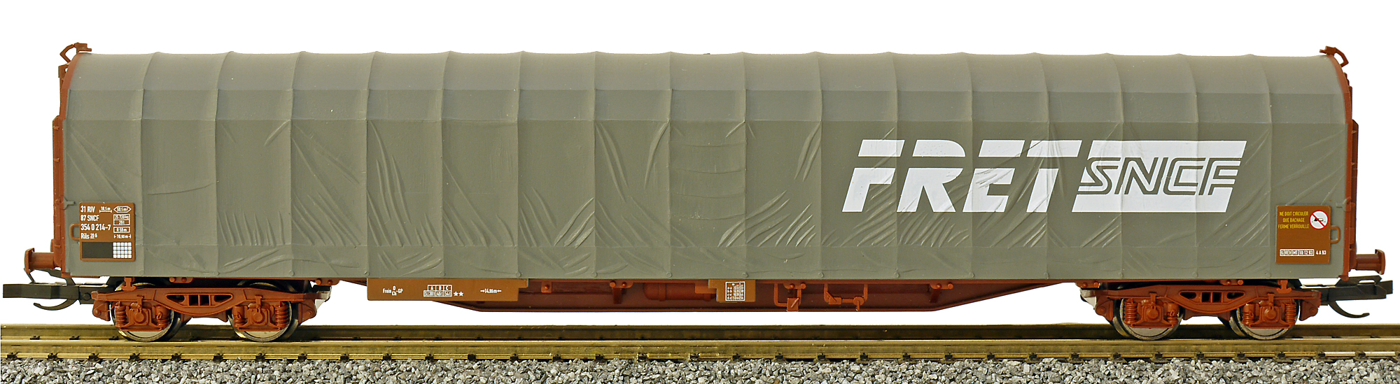 | nízkostěnný nákladní vůz červenohnědý s šedou plachtou „FRET“ |