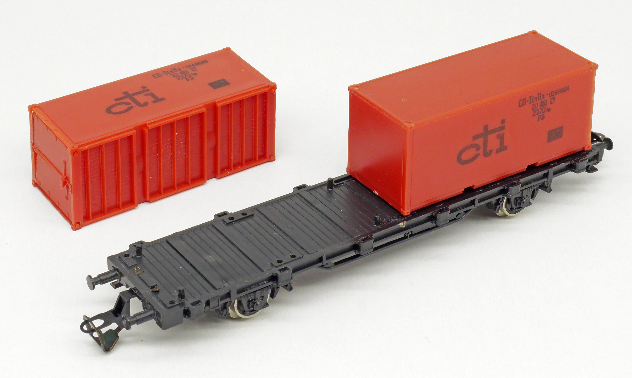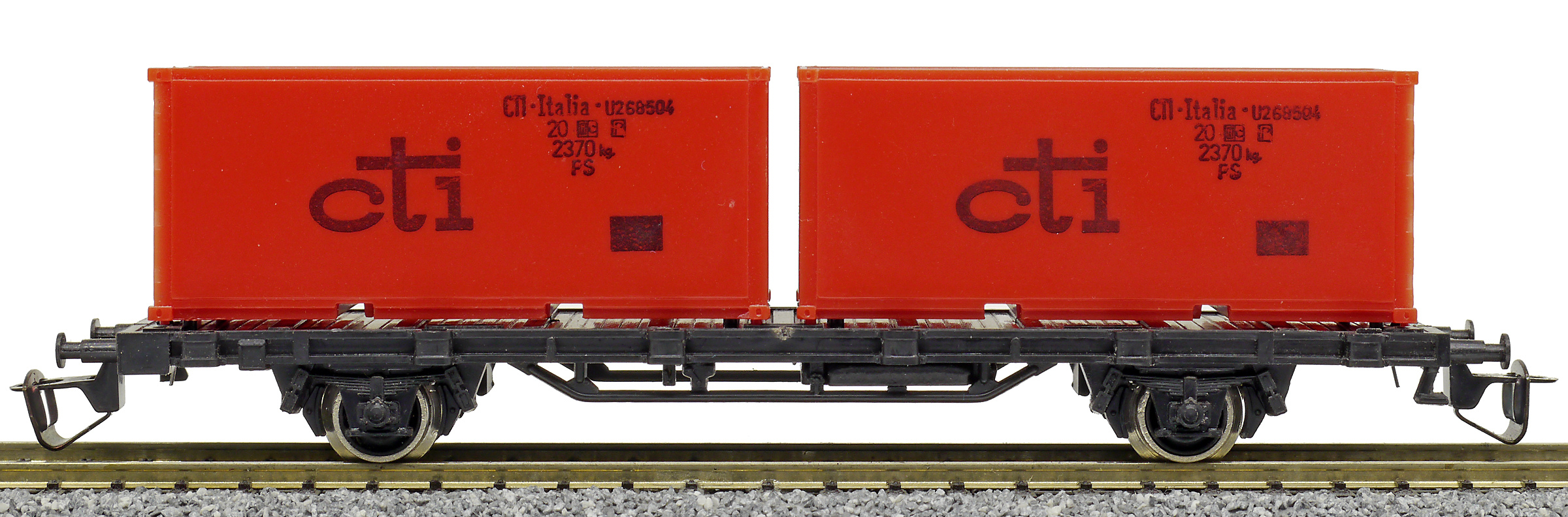 | nákladní plošinový vůz černý se dvěma 20' kontejnery „cti“ |