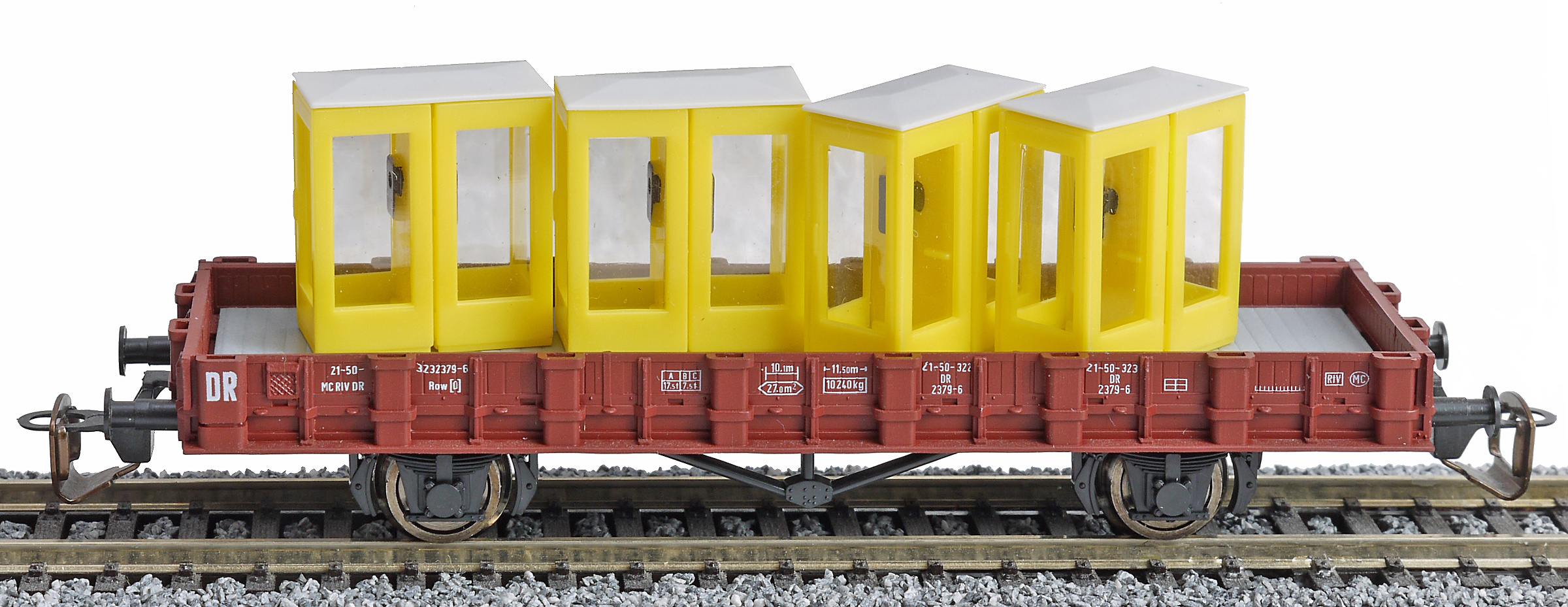 | nízkostěnný nákladní vůz červenohnědý s nákladem telefonních budek |