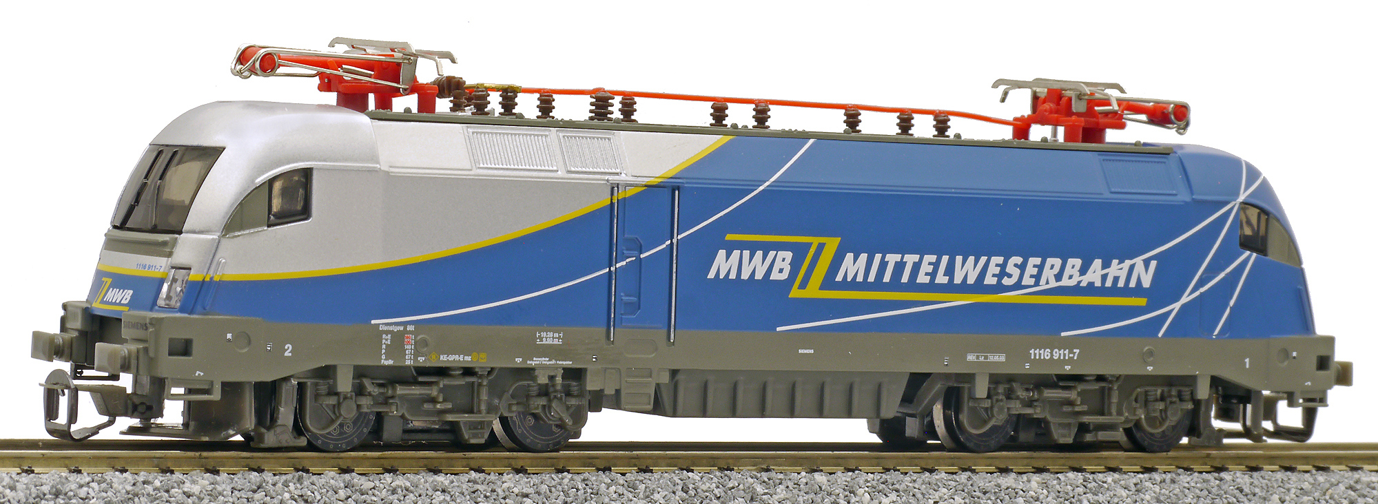 | elektrická lokomotiva modrá-stříbrná s šedým rámem „MWB - Mittelweserbahn“ |