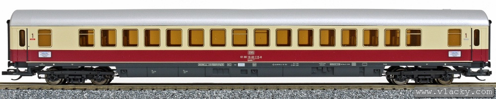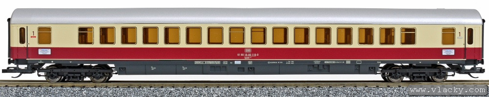 | vínově červený-krémový se stříbrnou střechou oddílový vůz 1. tř. |