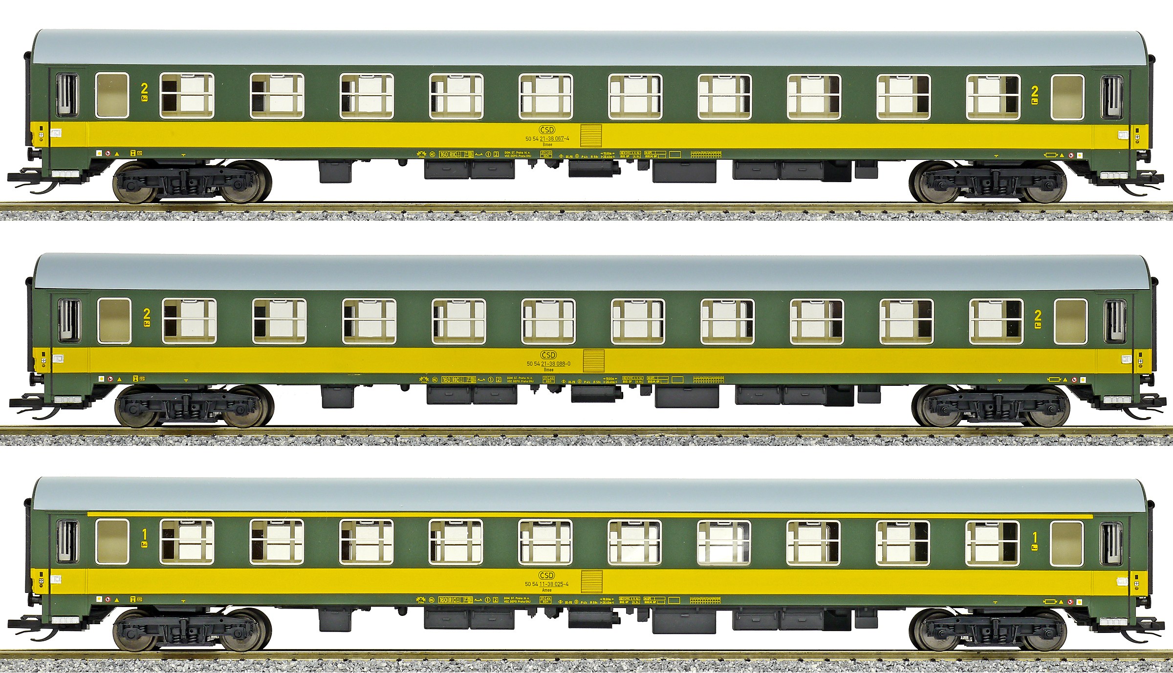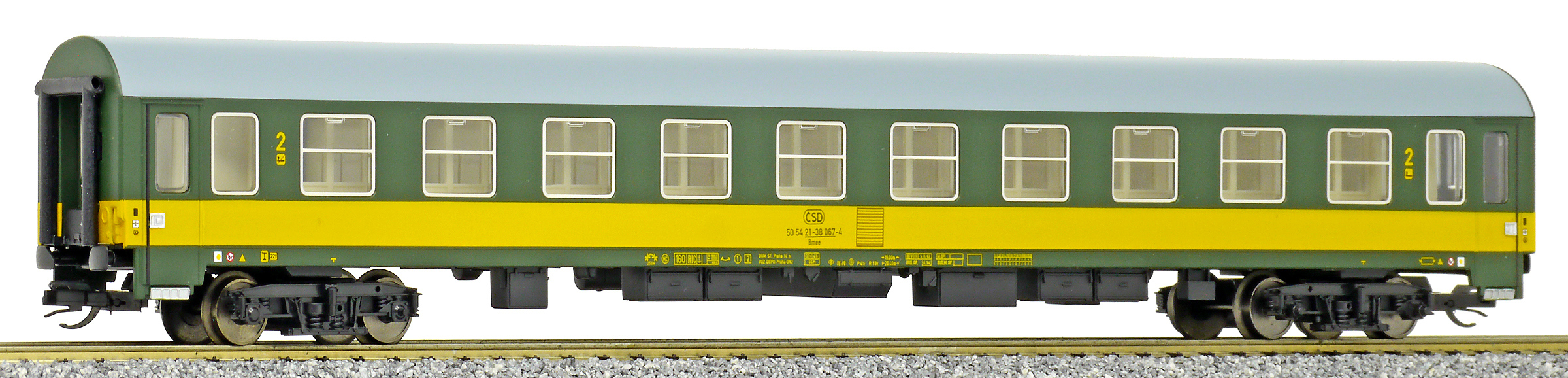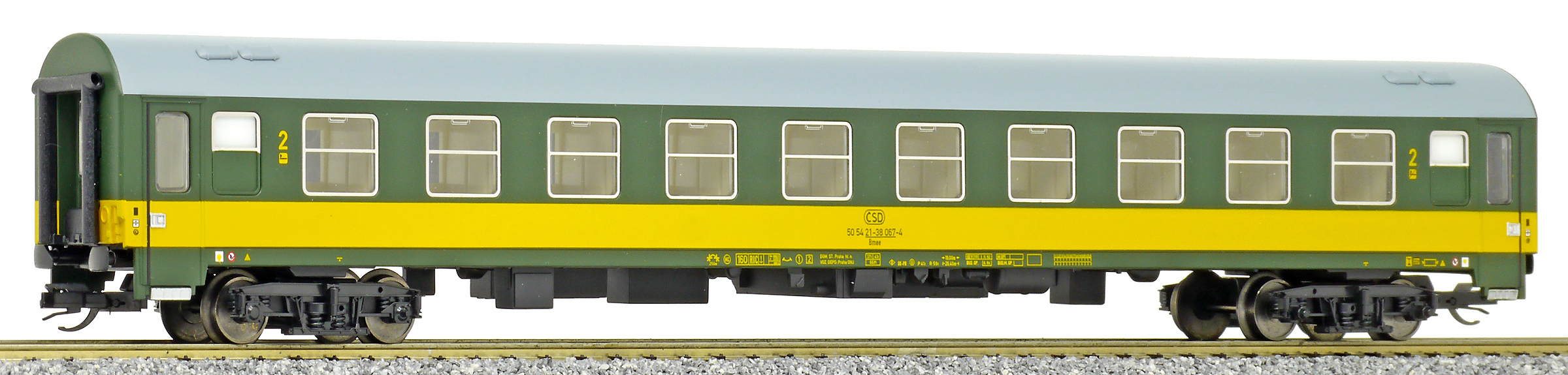 | rychlíkový vůz zelený se žlutým pruhem a šedou střechou 2. tř. |