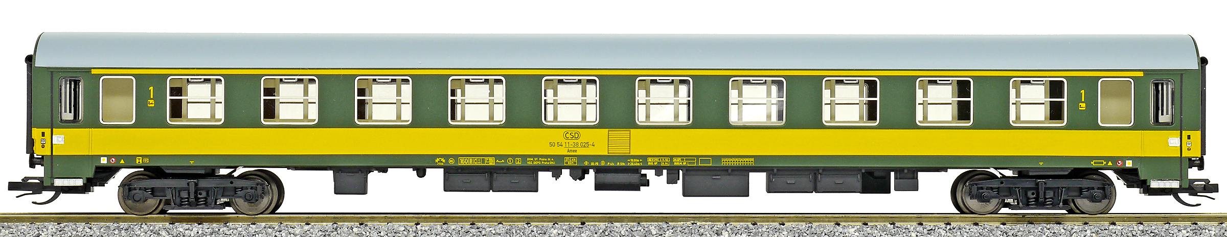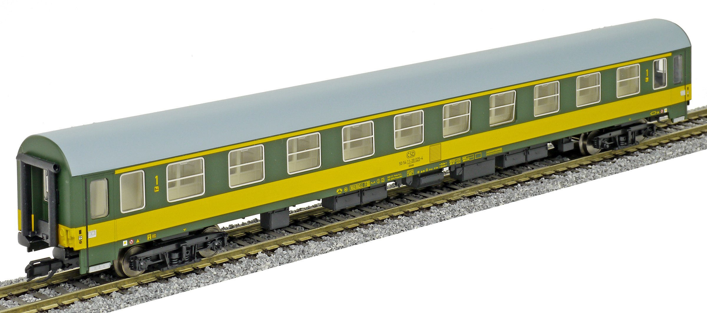 | rychlíkový vůz zelený se žlutým pruhem a šedou střechou 1. tř. |