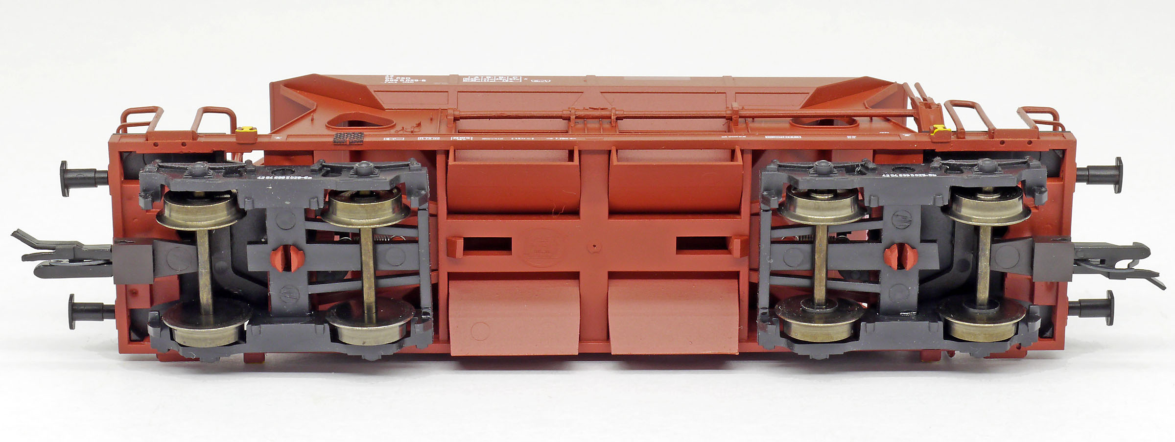 | nákladní samovýsypný vůz červenohnědý s opravnými fleky, černé plošinky |