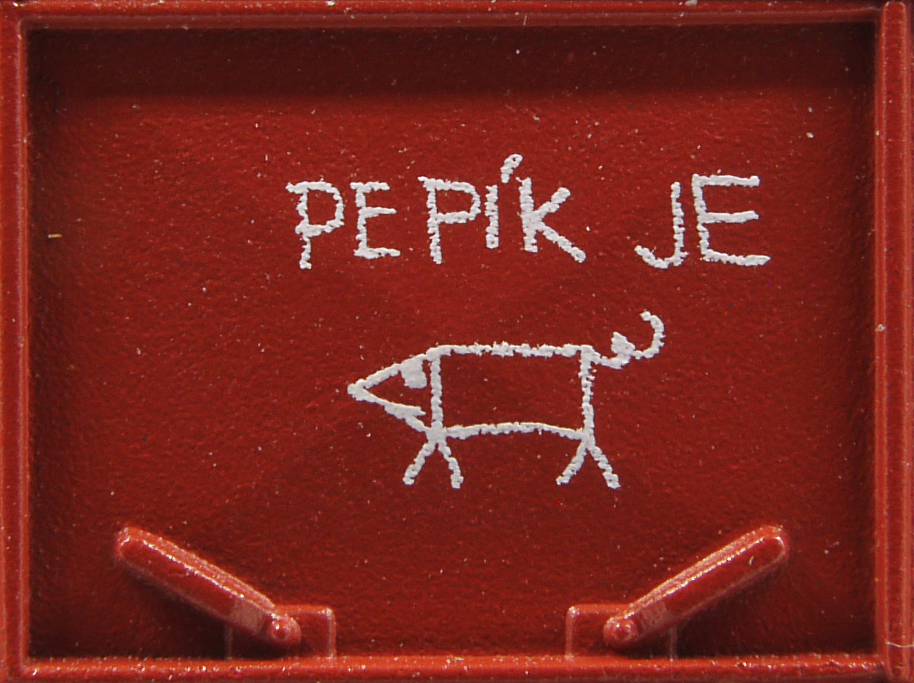 | otevřený nákladní vůz červenohnědý s bílým obrázkem „Pepík je ...“ |