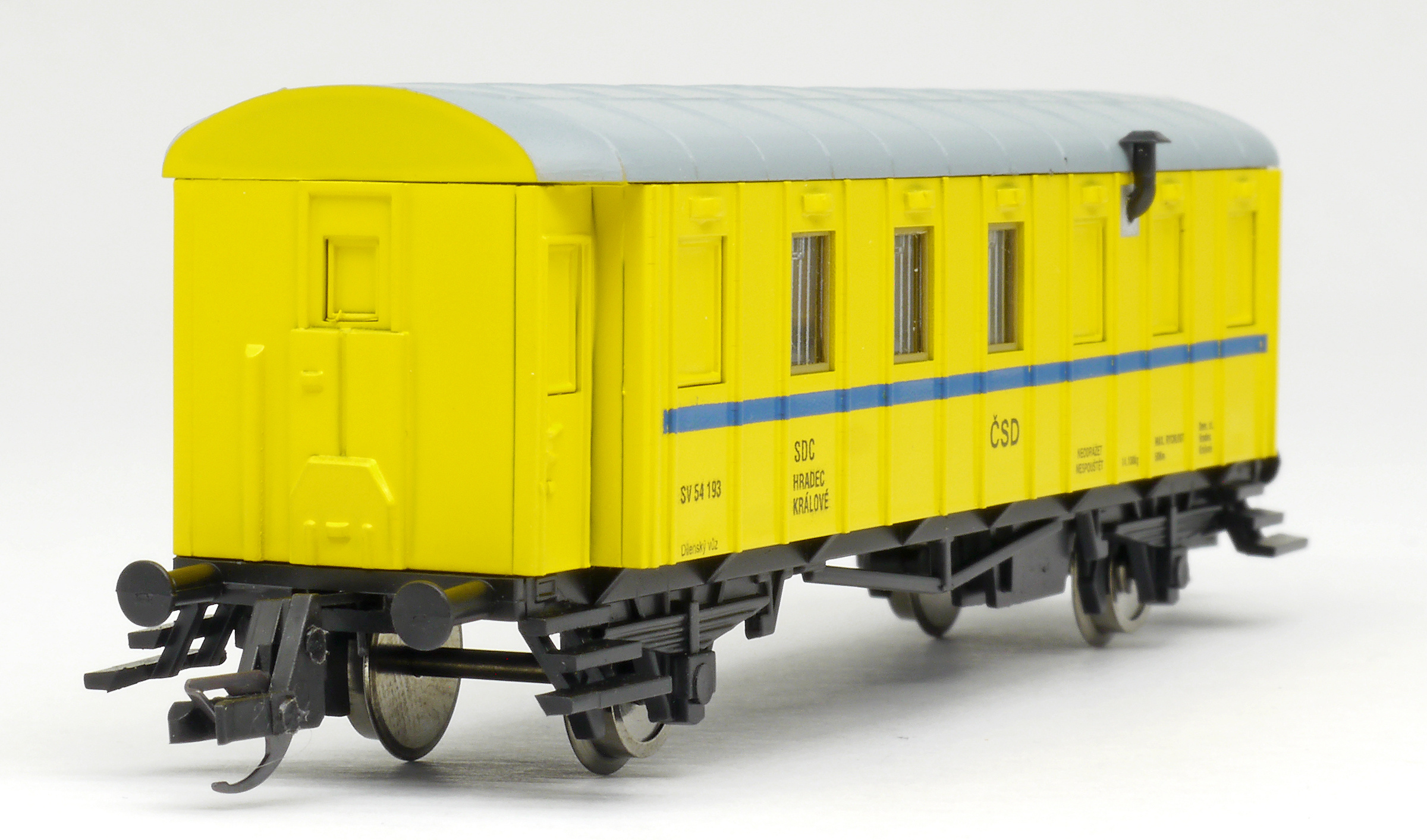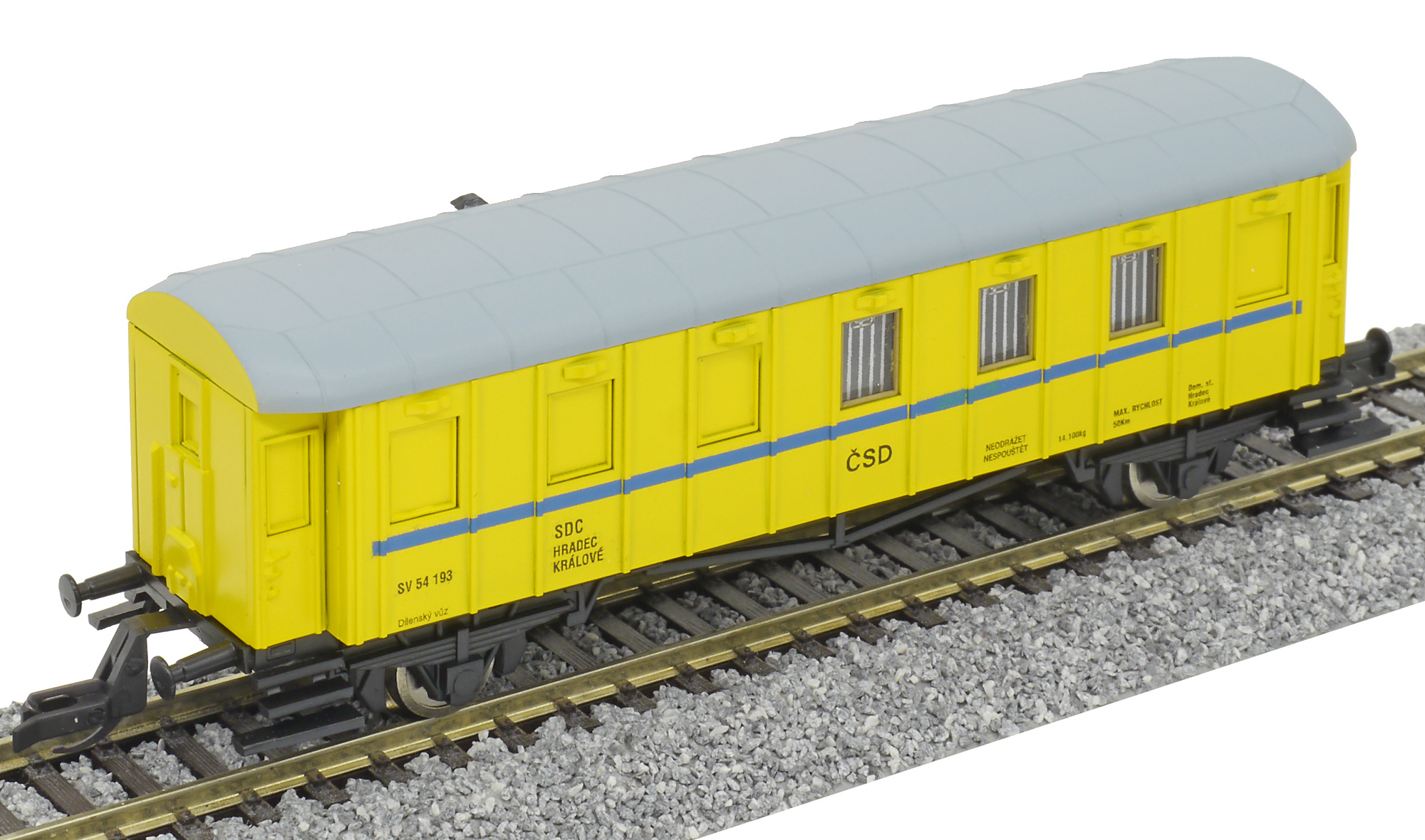 | dílenský vůz žlutý modrým proužkem a šedou střechou |