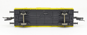 | nízkostěnný vůz žlutý s nákladem maringotky |