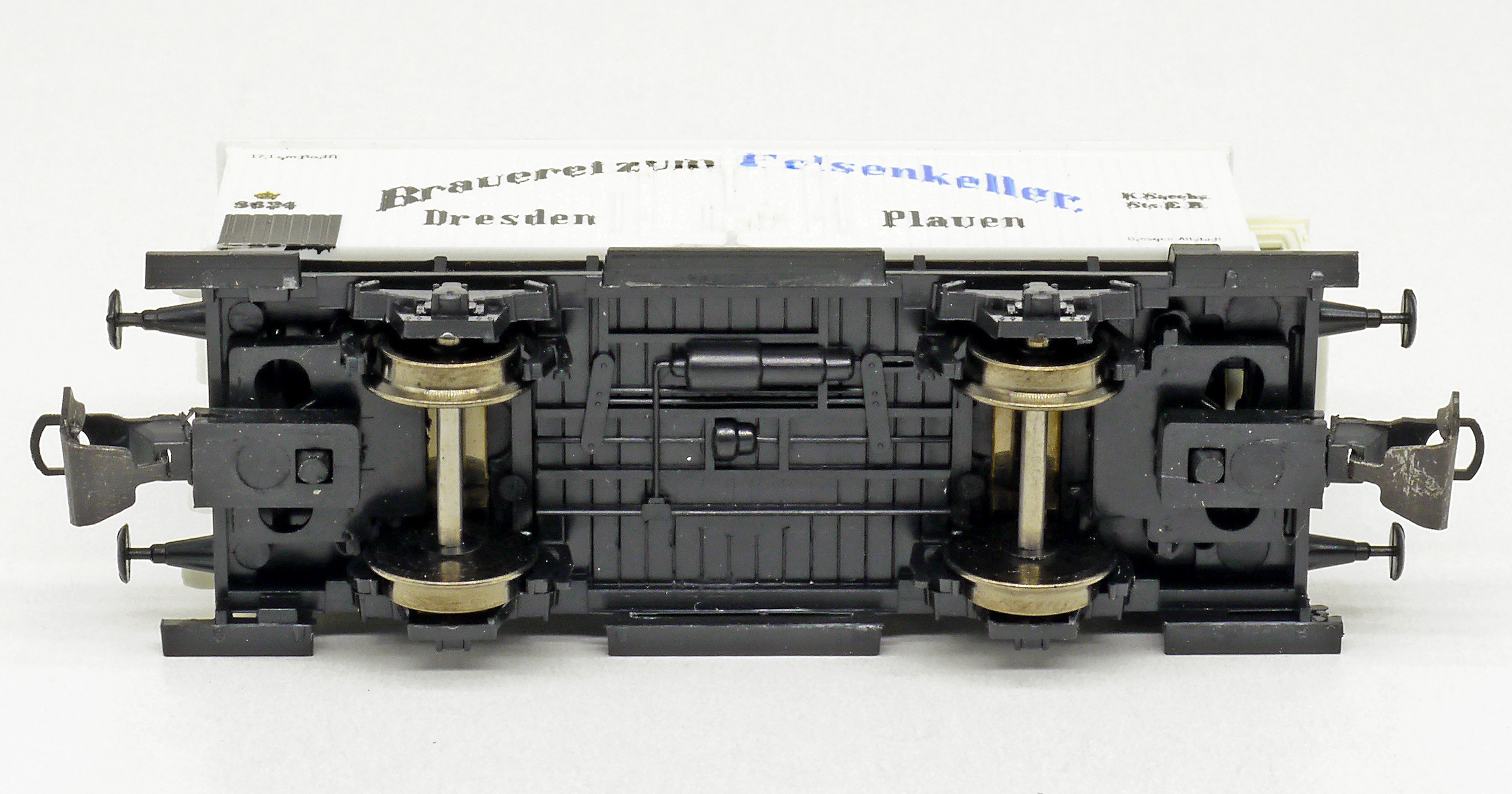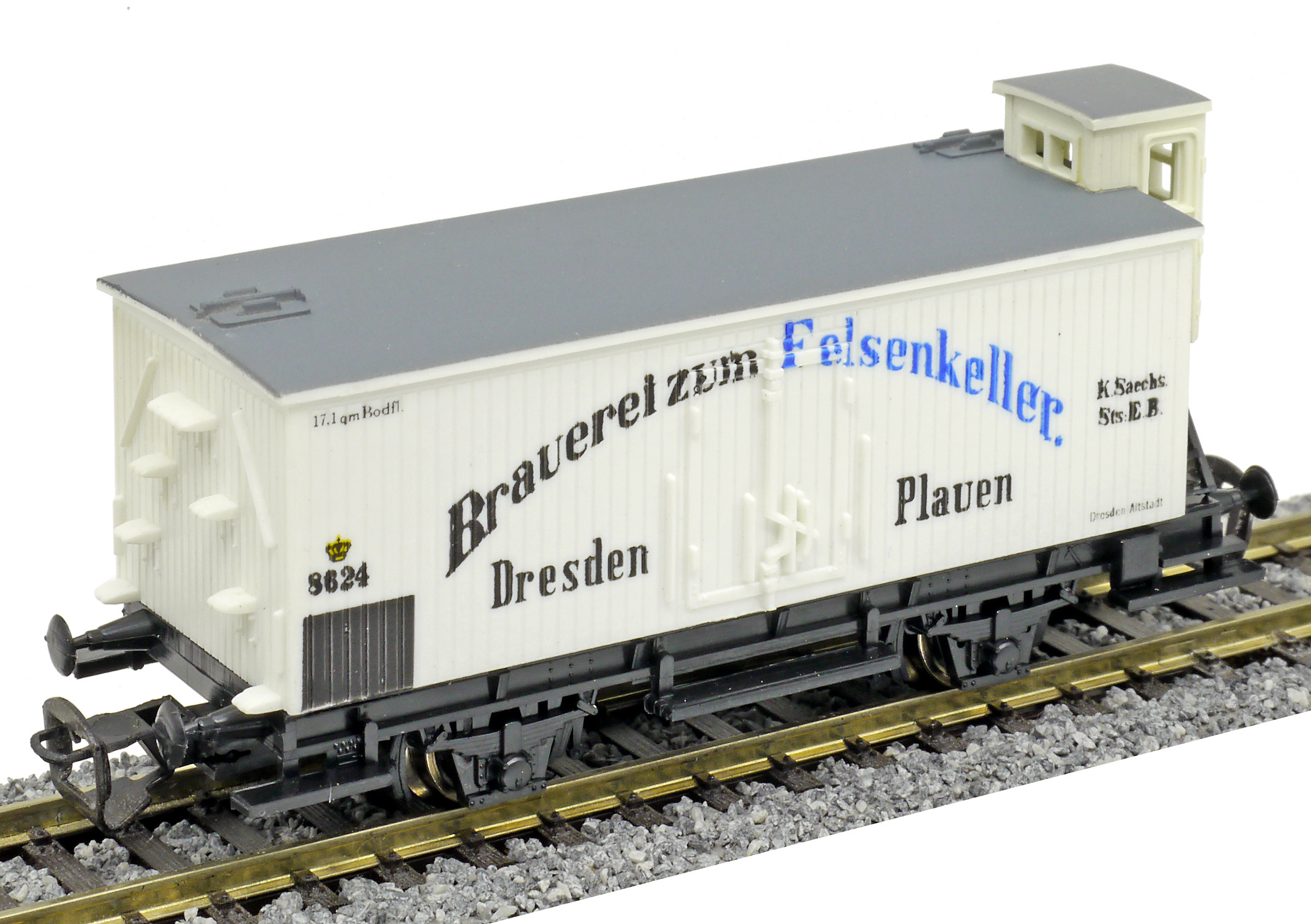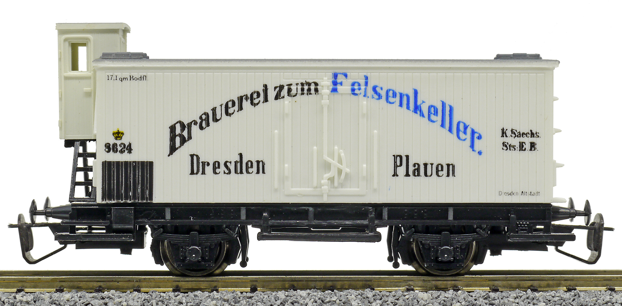 | nákladní chladící vůz bílý s šedou střechou a brzdařskou budkou „Felsenkeller“ |