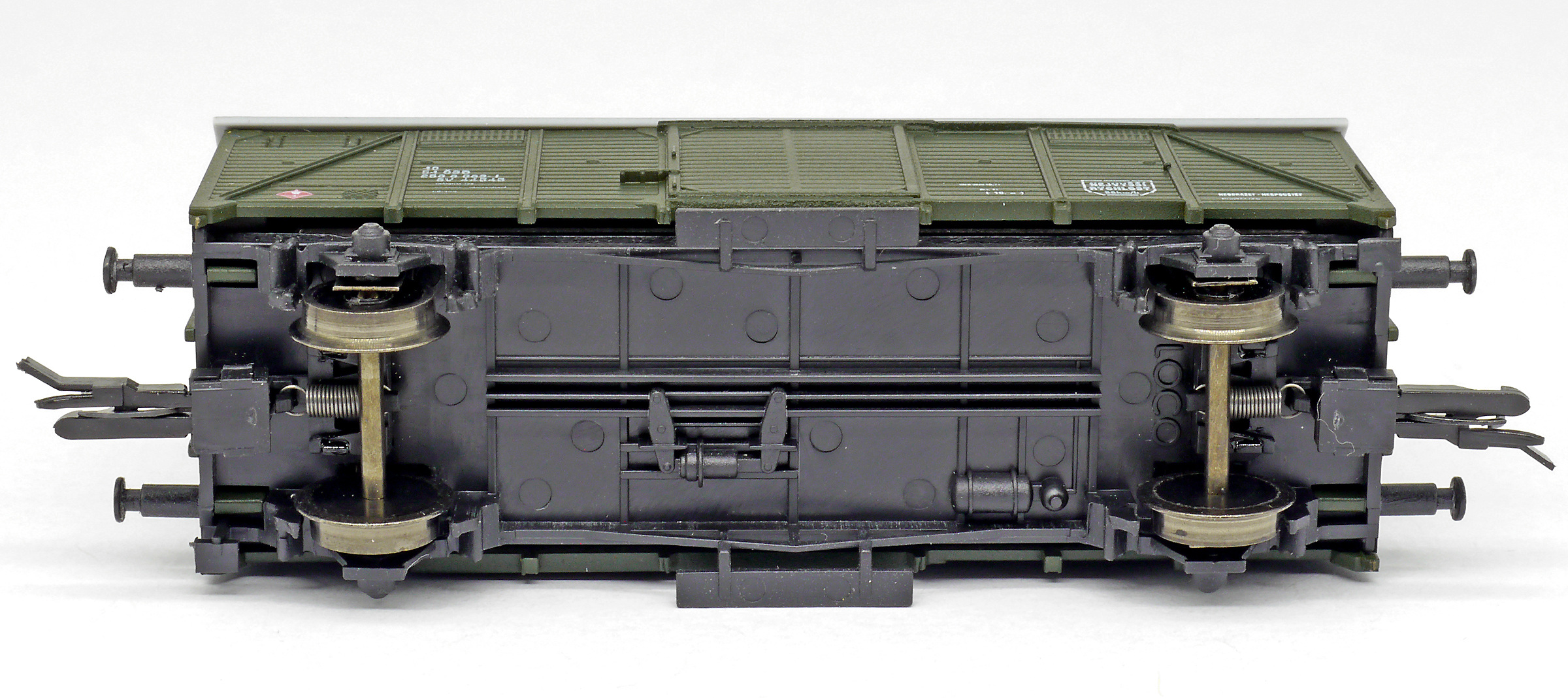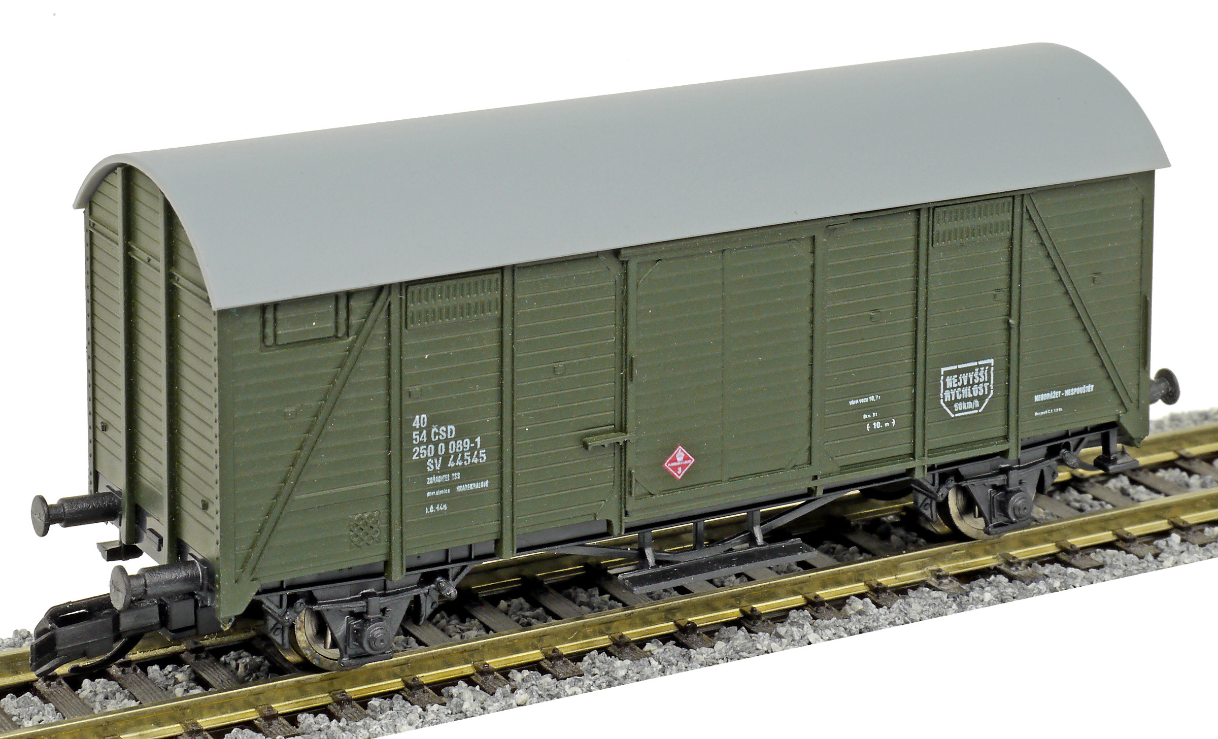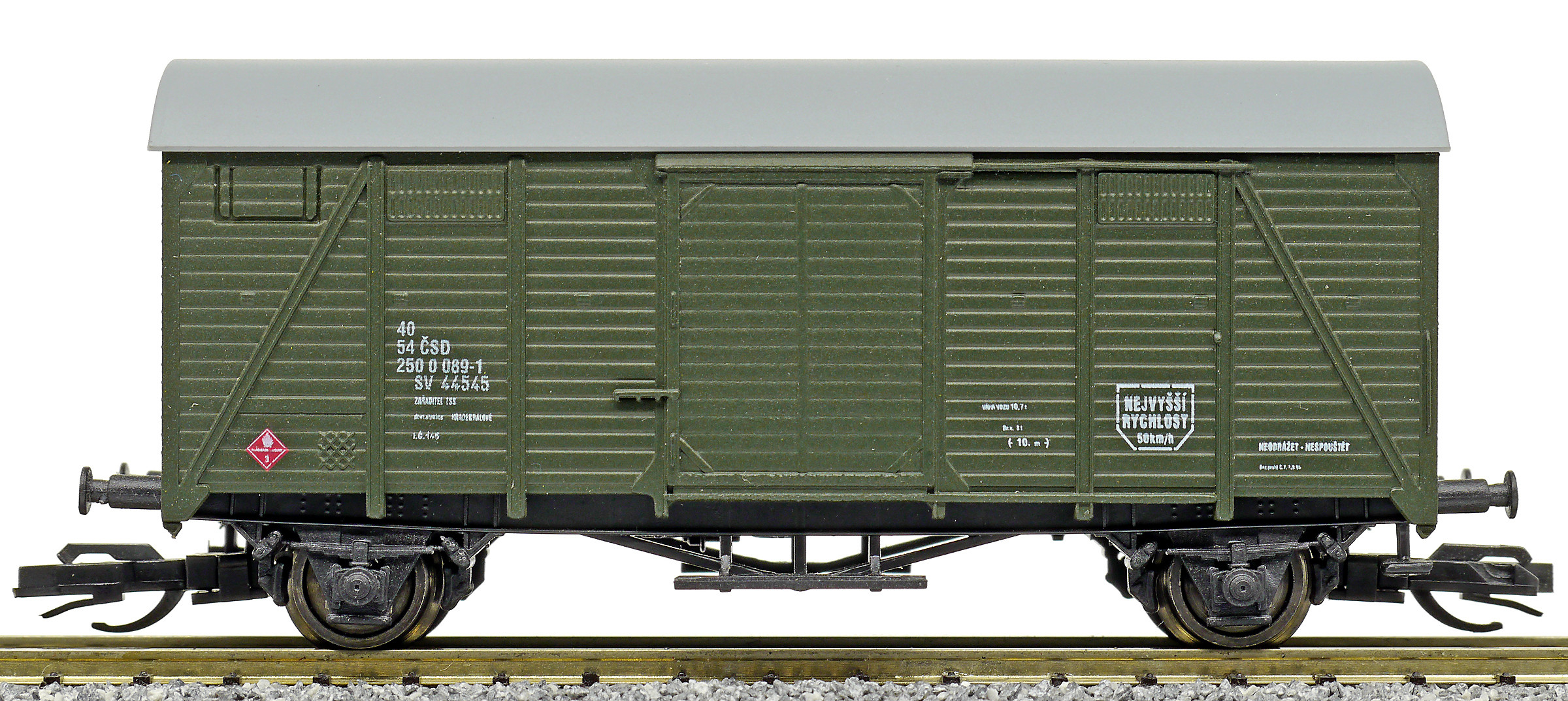 | krytý nákladní vůz zelený s šedou střechou do pracovního vlaku |