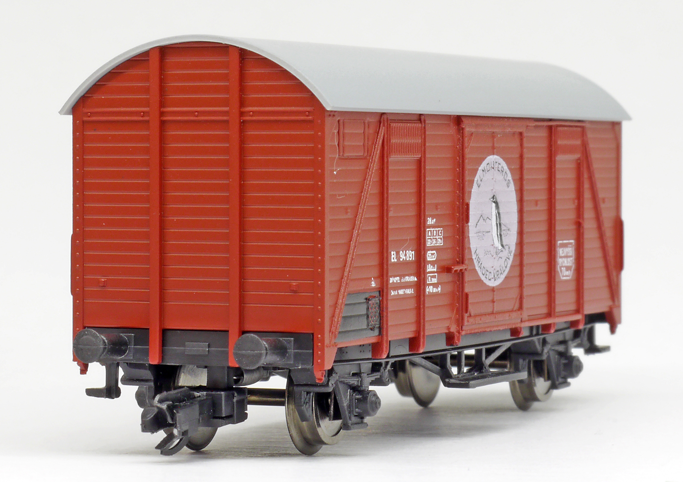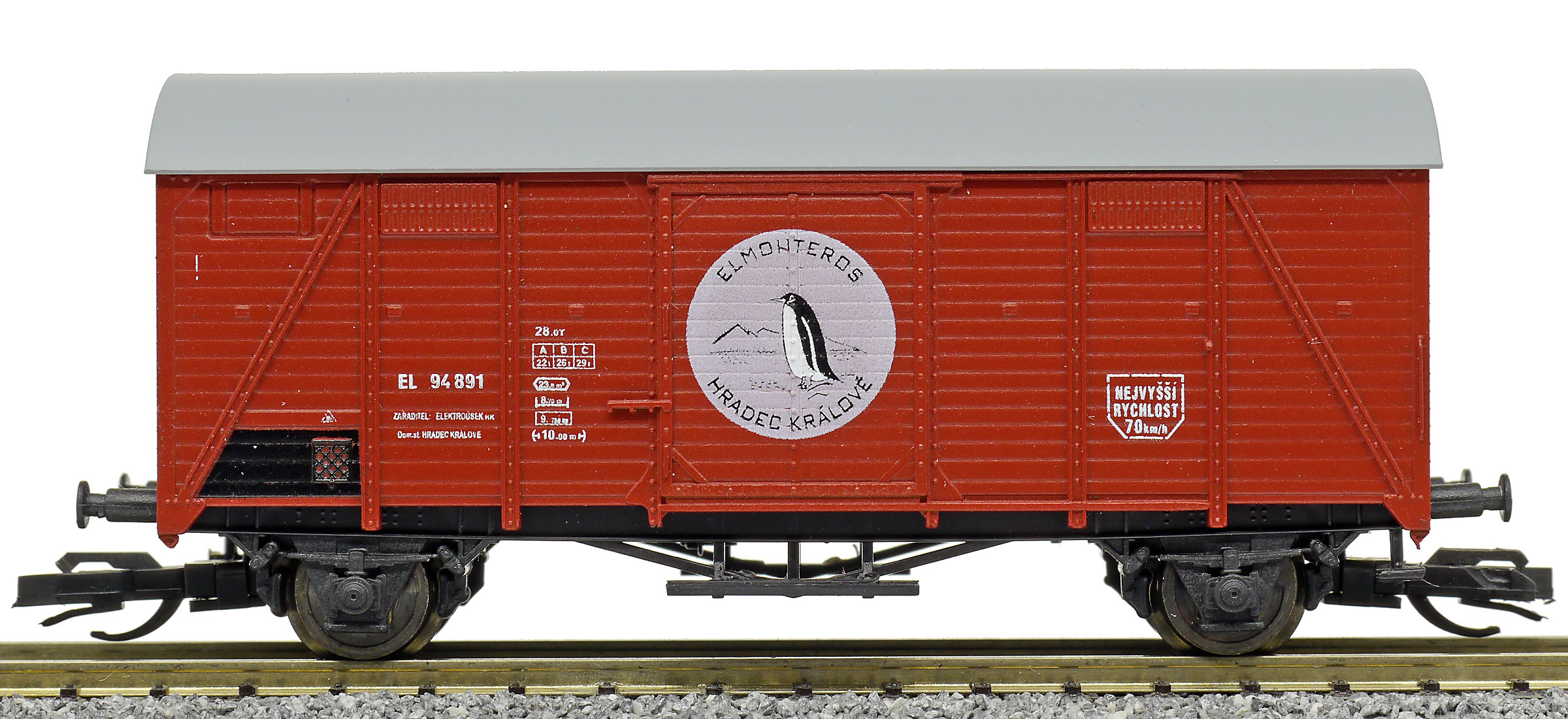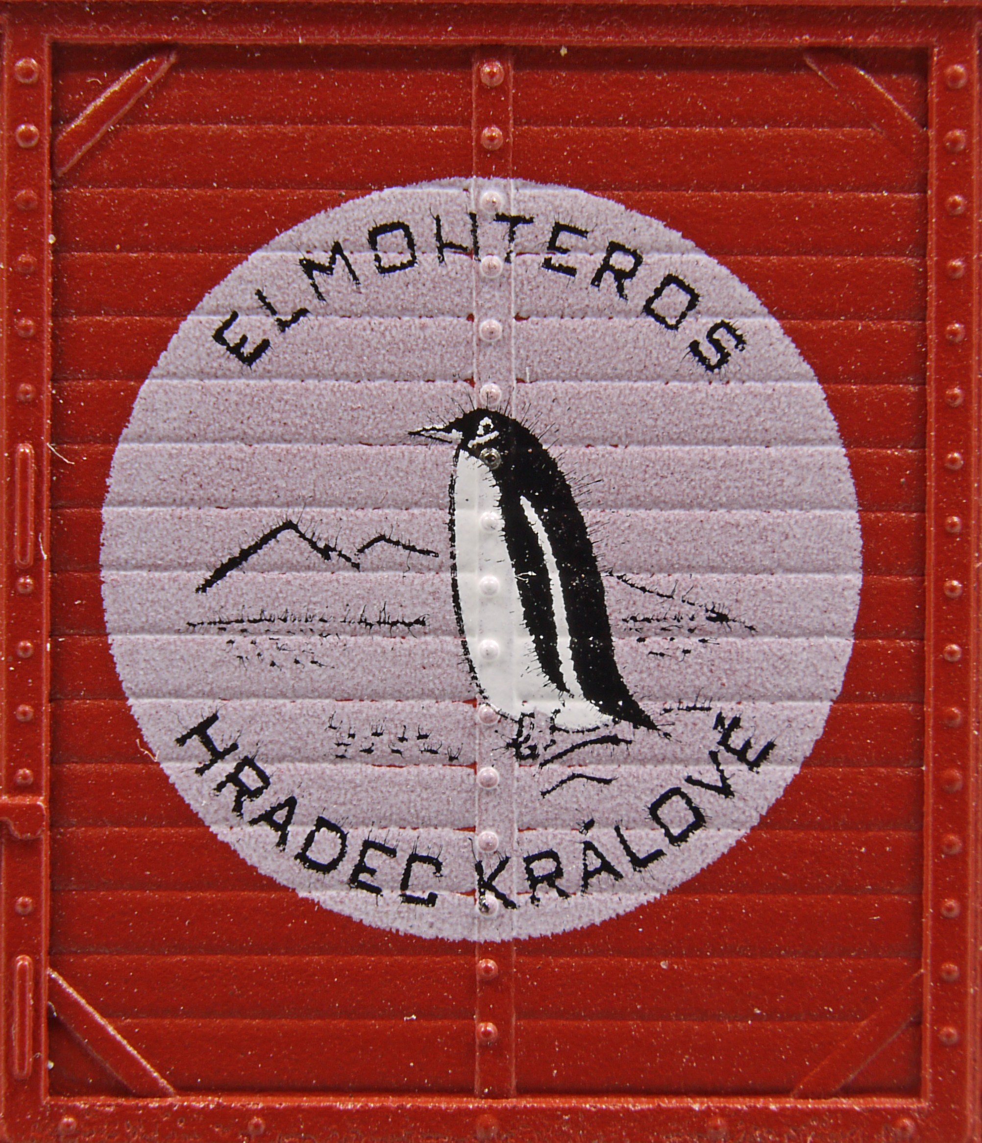 | krytý nákladní vůz červenohnědý s šedou střechou „ELMONTEROS Hradec Králové”, logo tučňák |