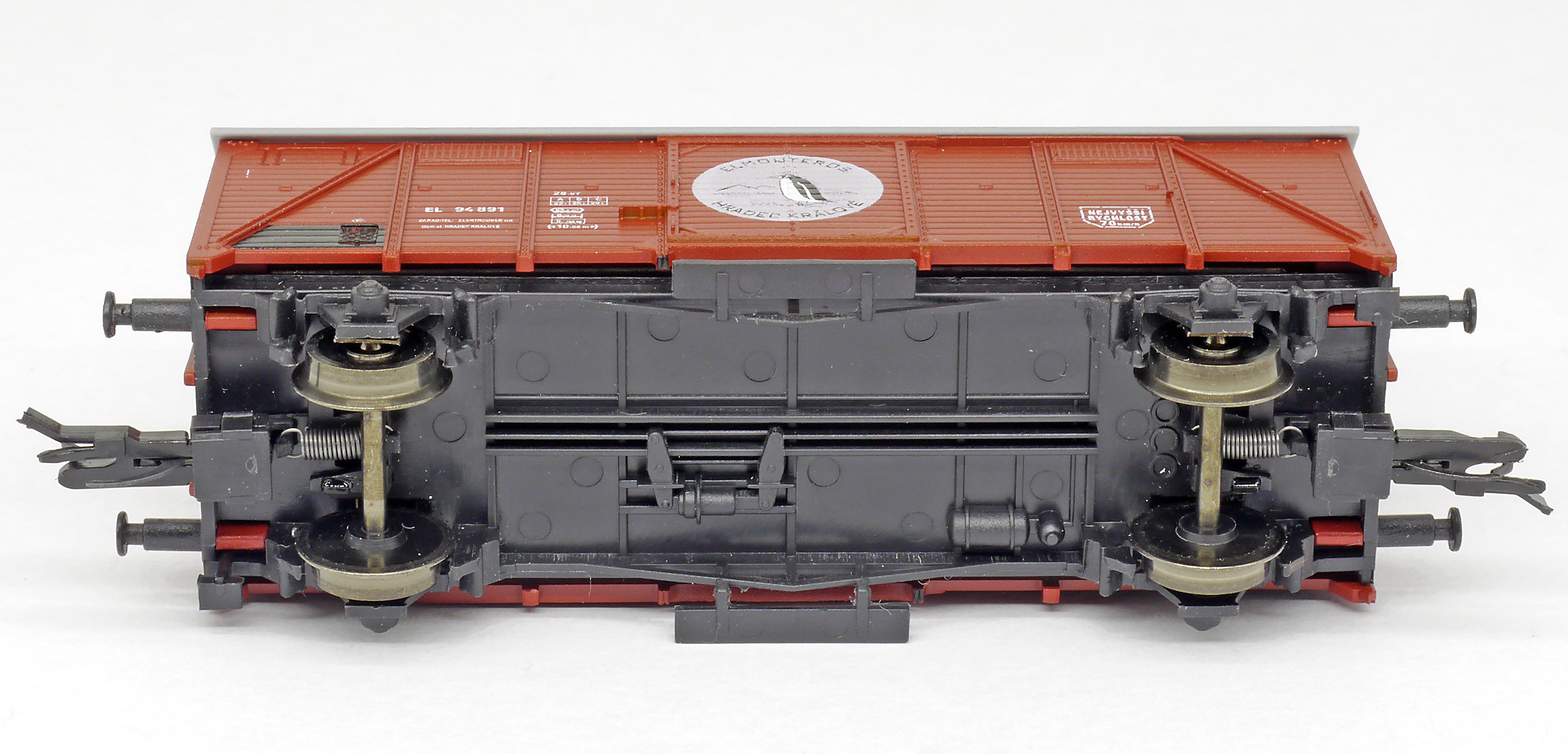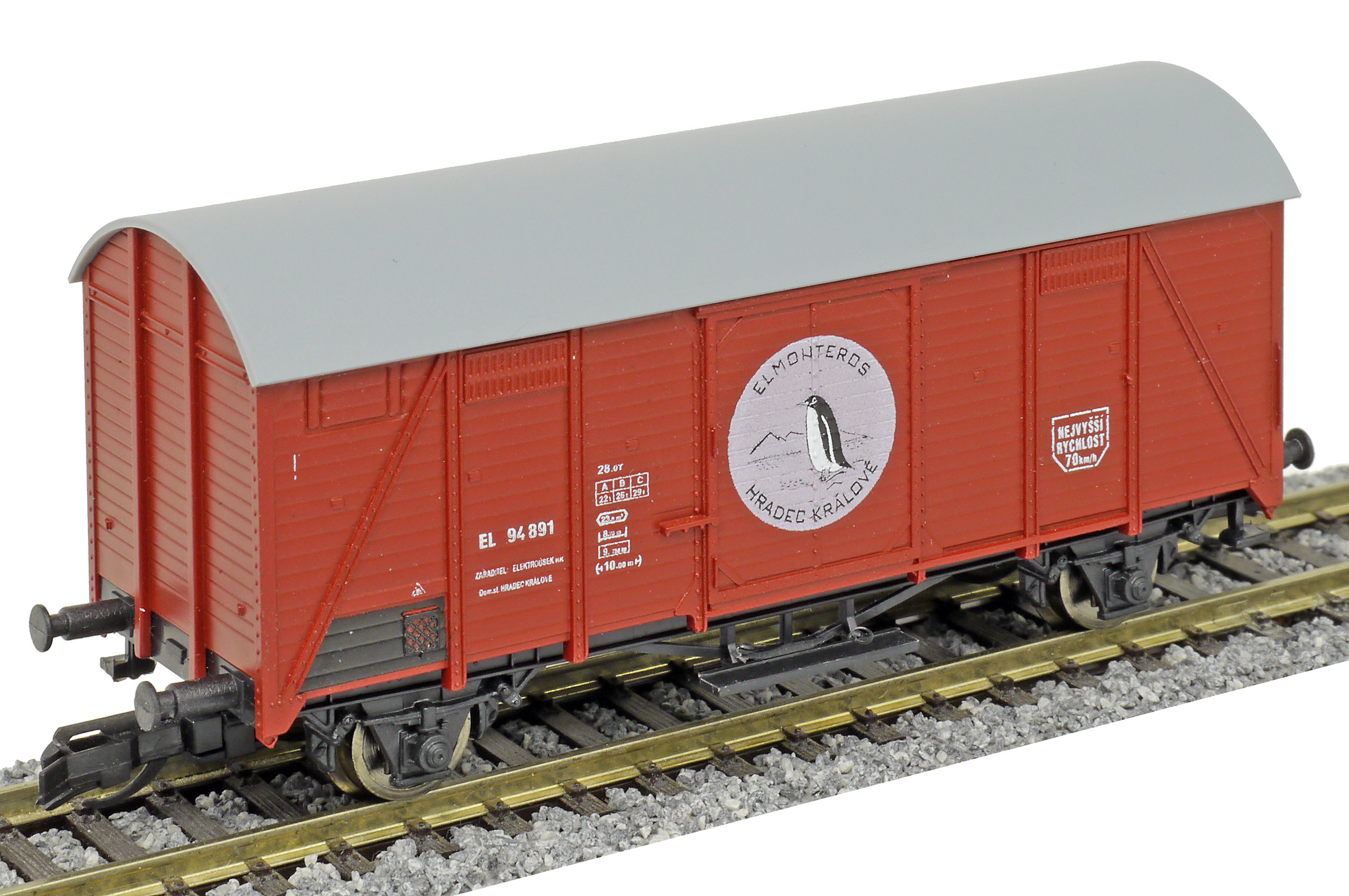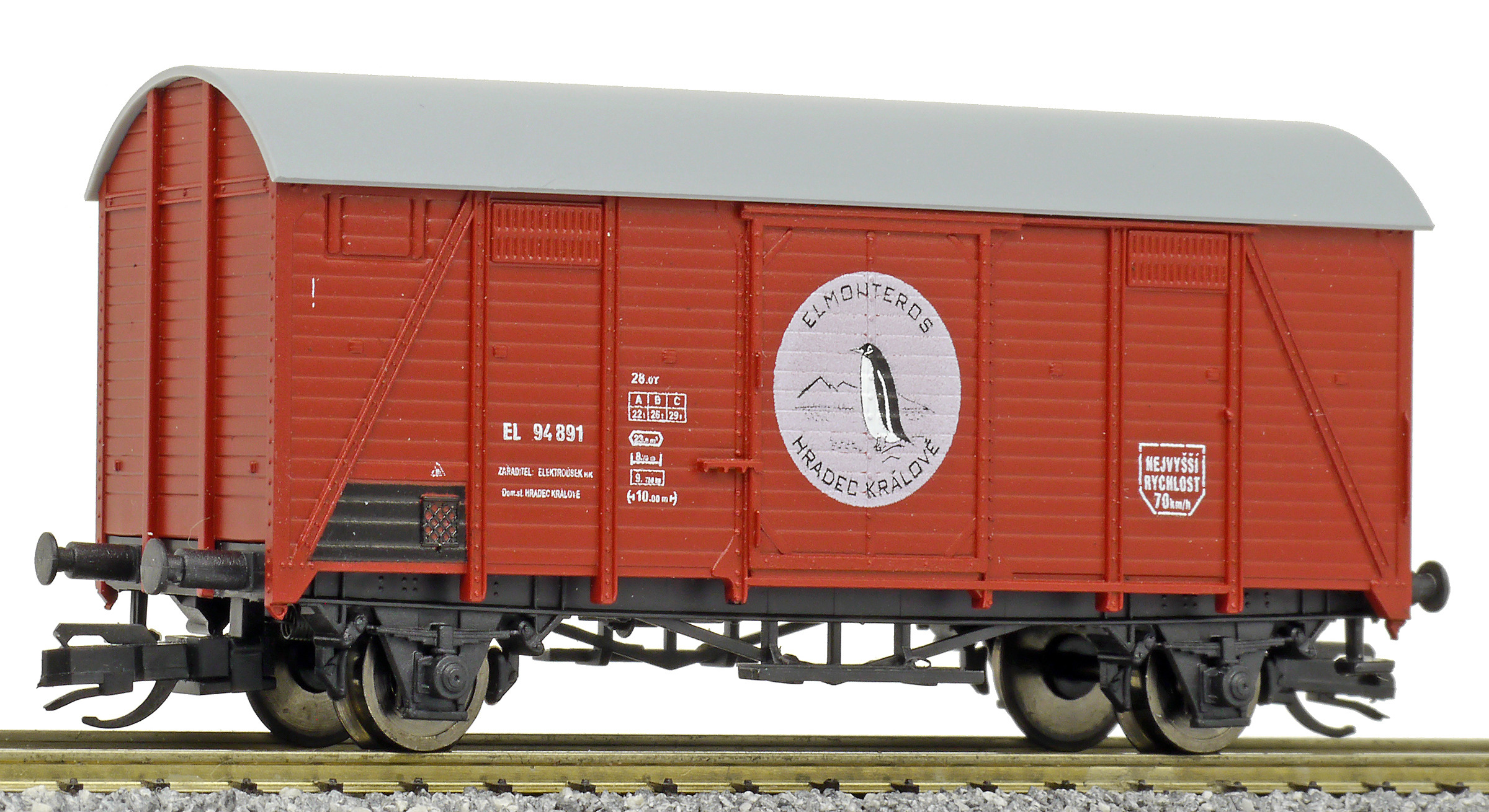 | krytý nákladní vůz červenohnědý s šedou střechou „ELMONTEROS Hradec Králové”, logo tučňák |