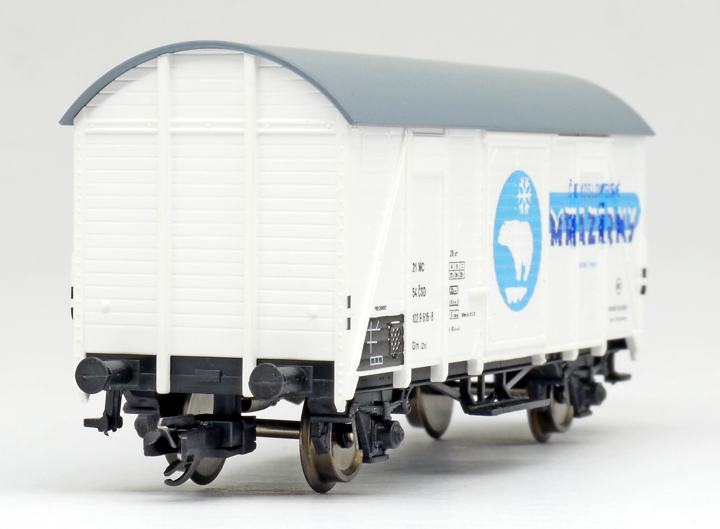 | krytý nákladní vůz bílý s šedou střechou „Československé mrazírny”, logo medvěd |