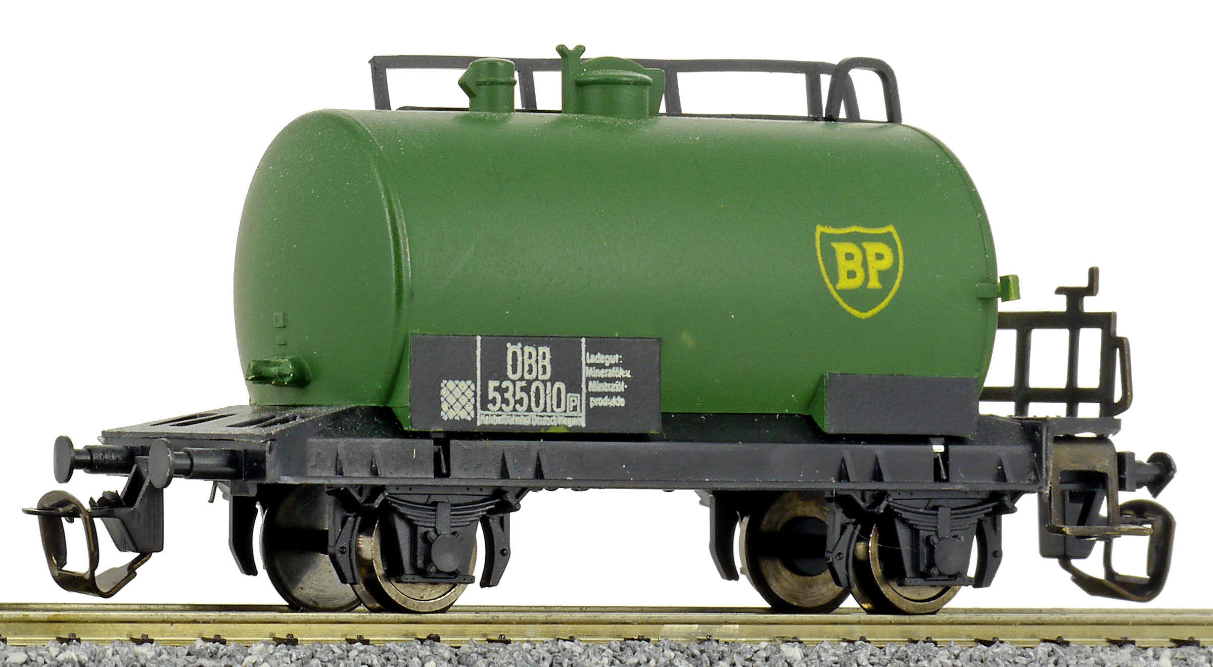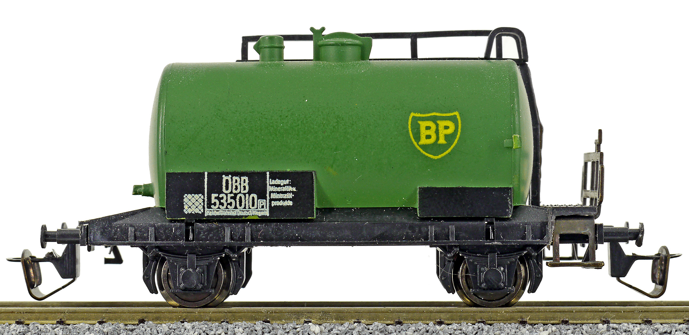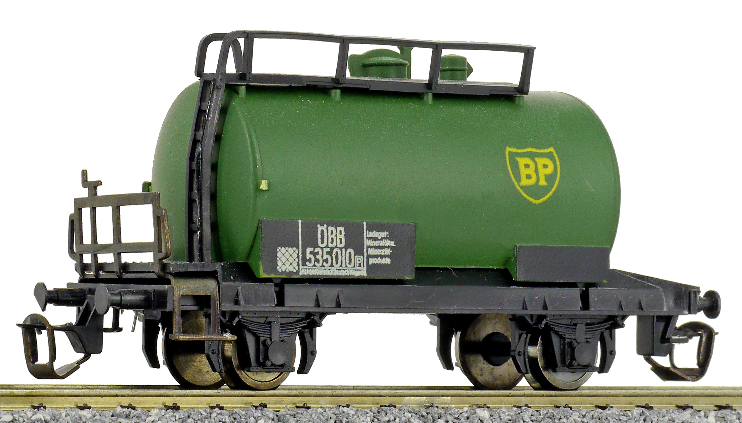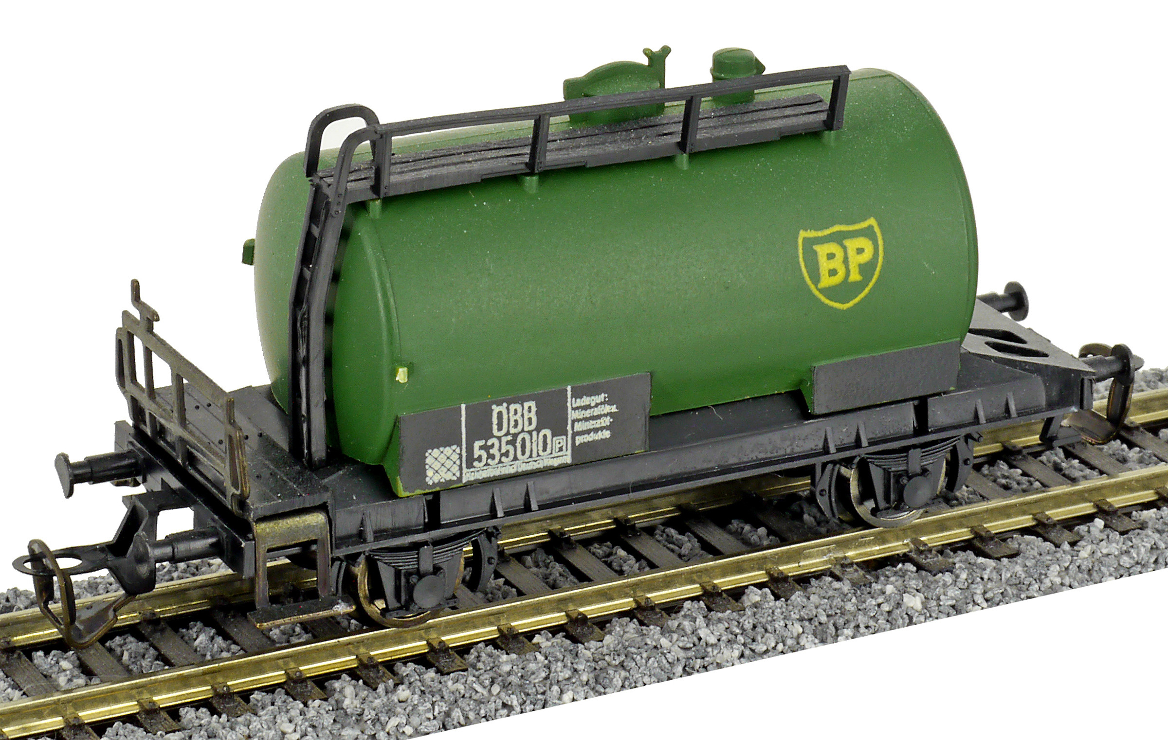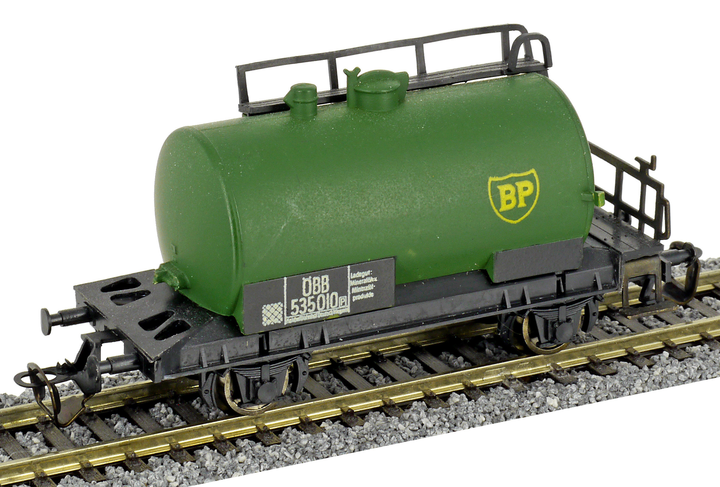 kotlový vůz zelený s černým pojezdem a s logem „BP“