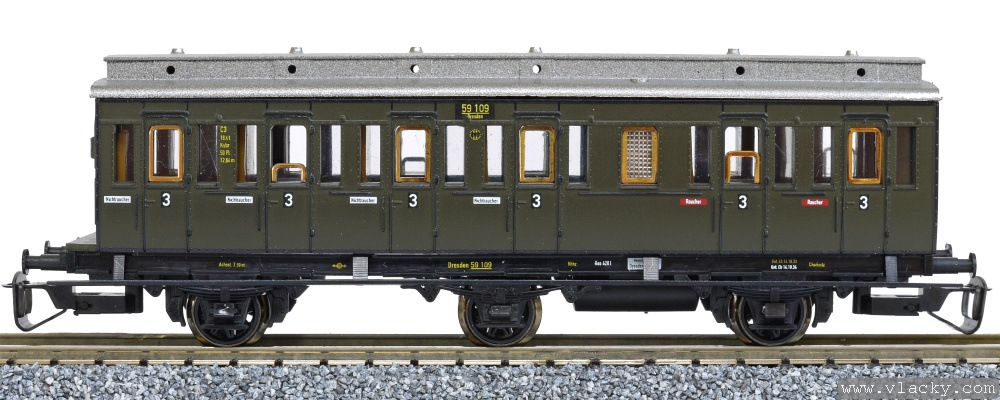 oddílový osobní vůz tmavě zelený se stříbrnou střechou 3. tř.