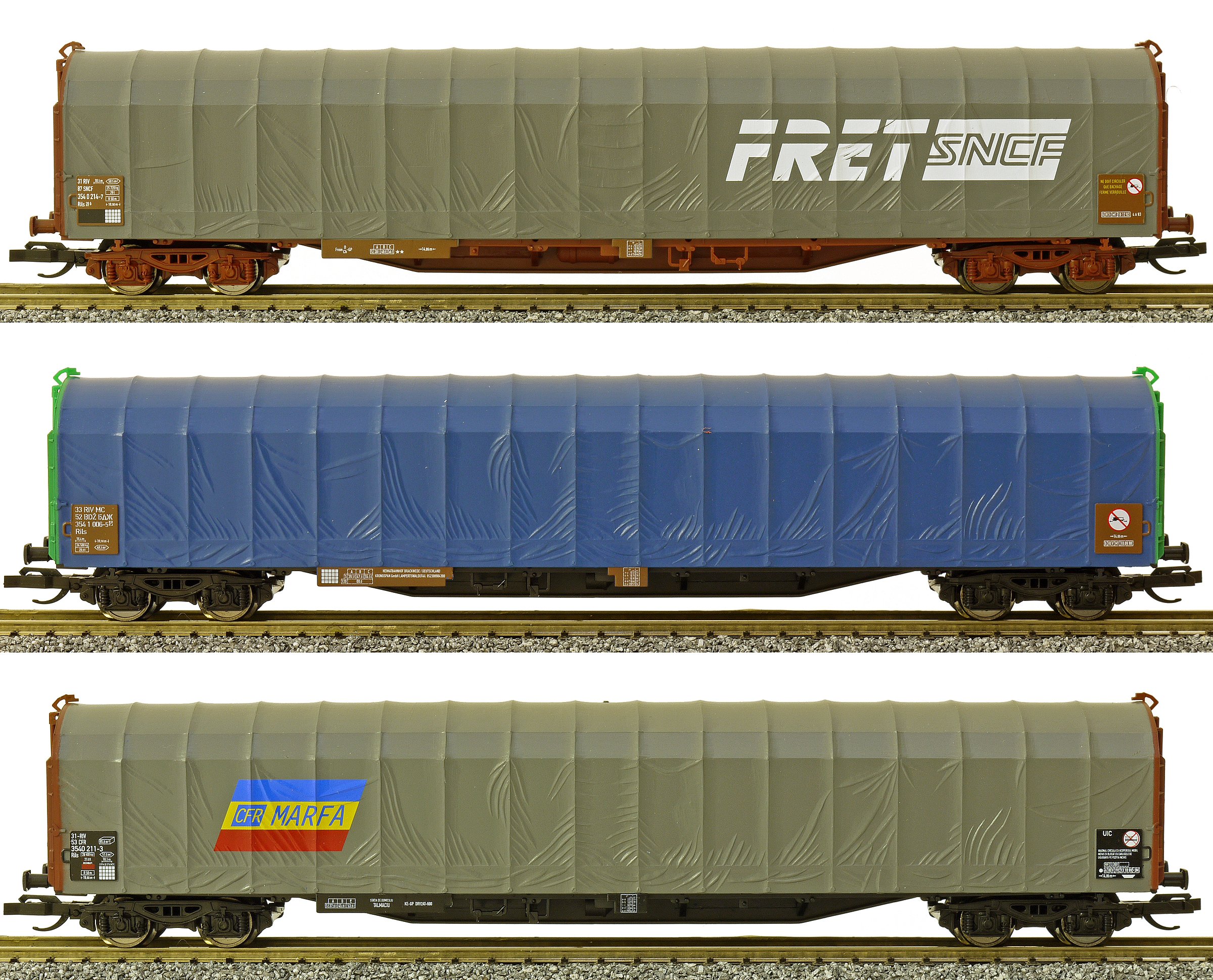 set tří nízkostěnných nákladních vozů s plachtou