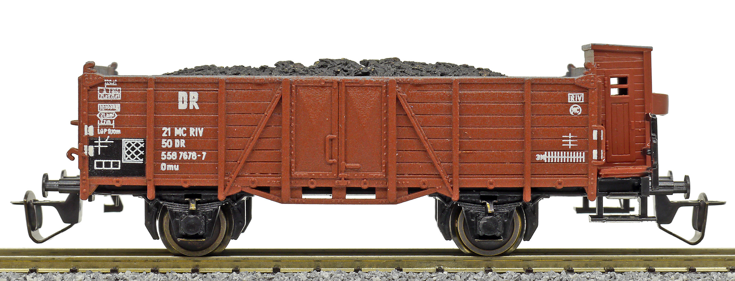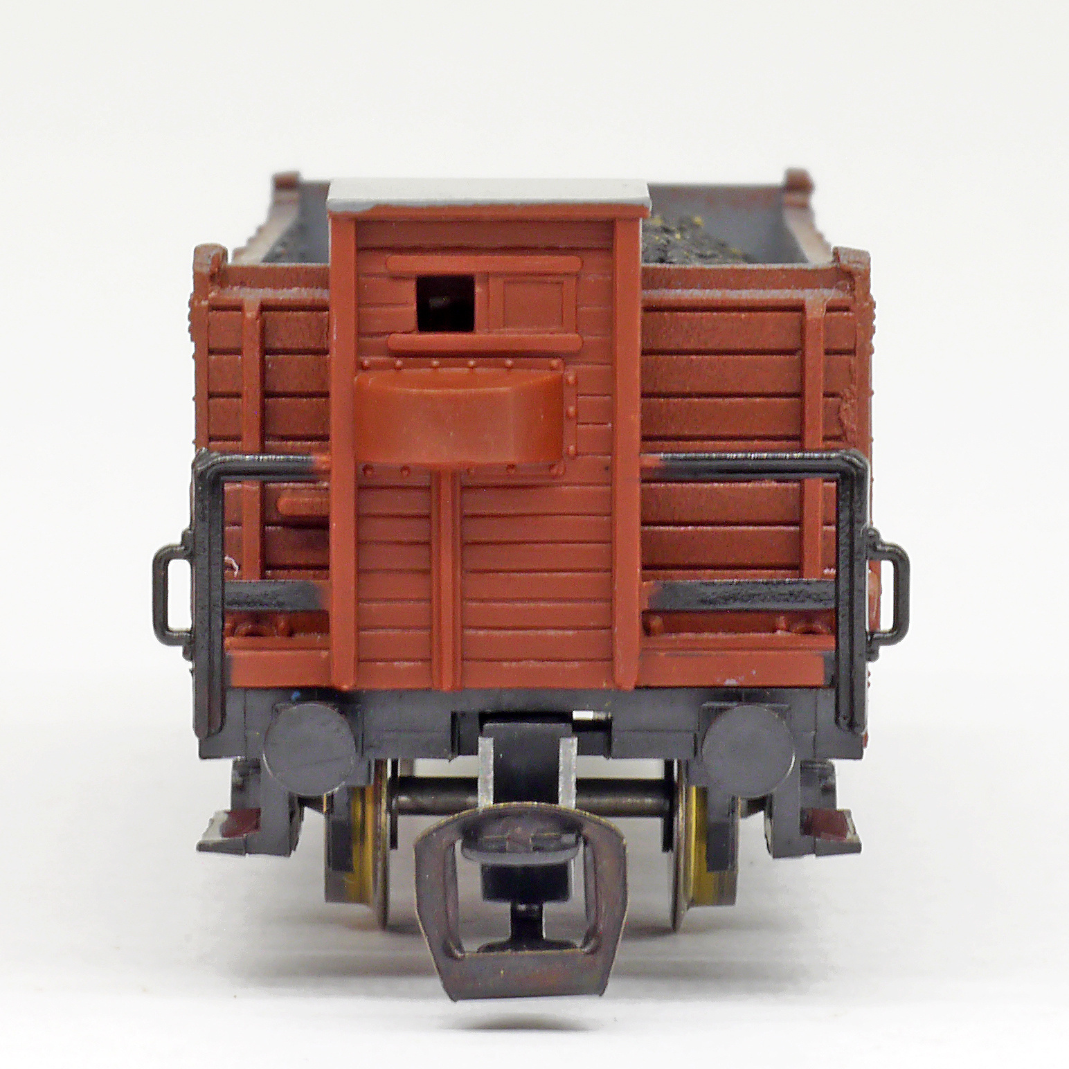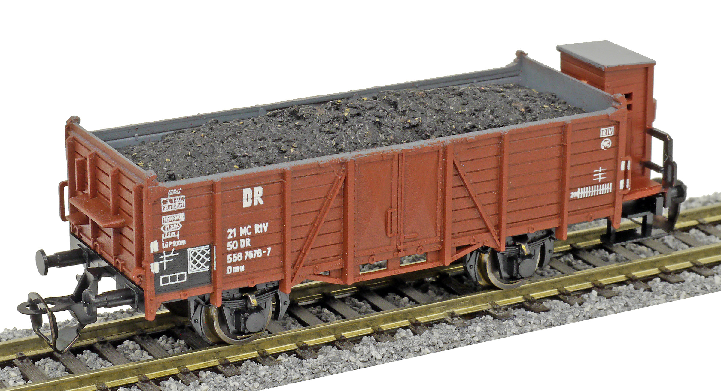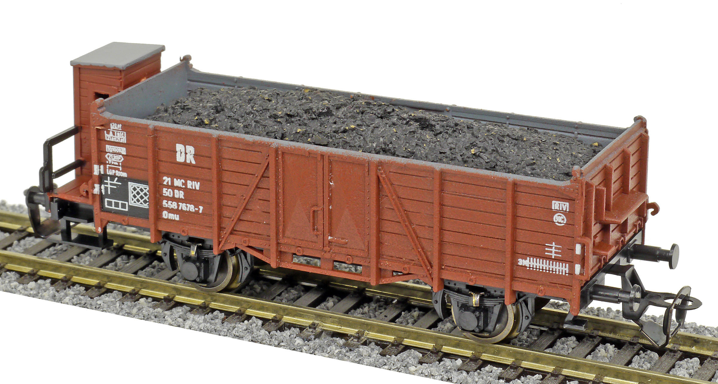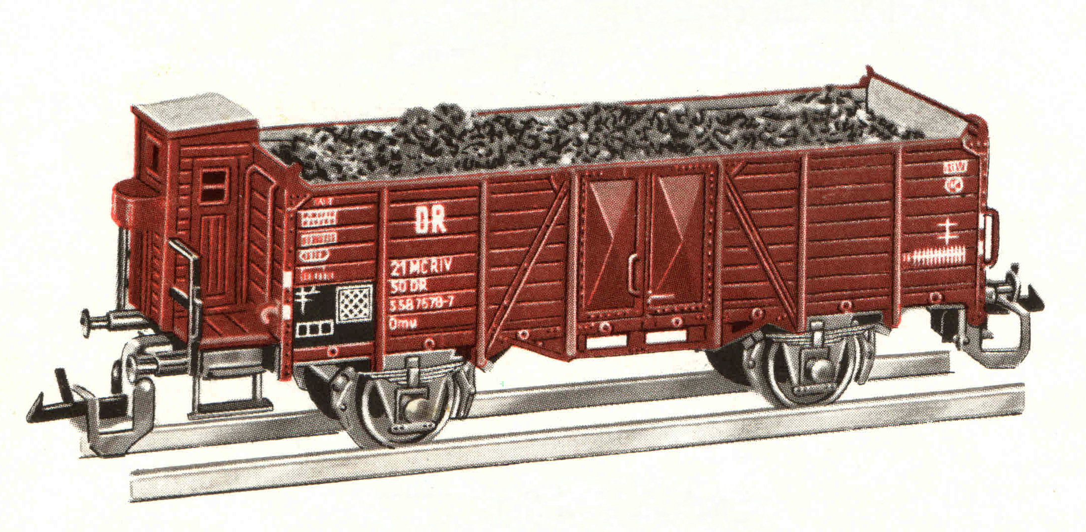 | otevřený nákladní vůz červenohnědý s brzdařskou budkou a nákladem uhlí |