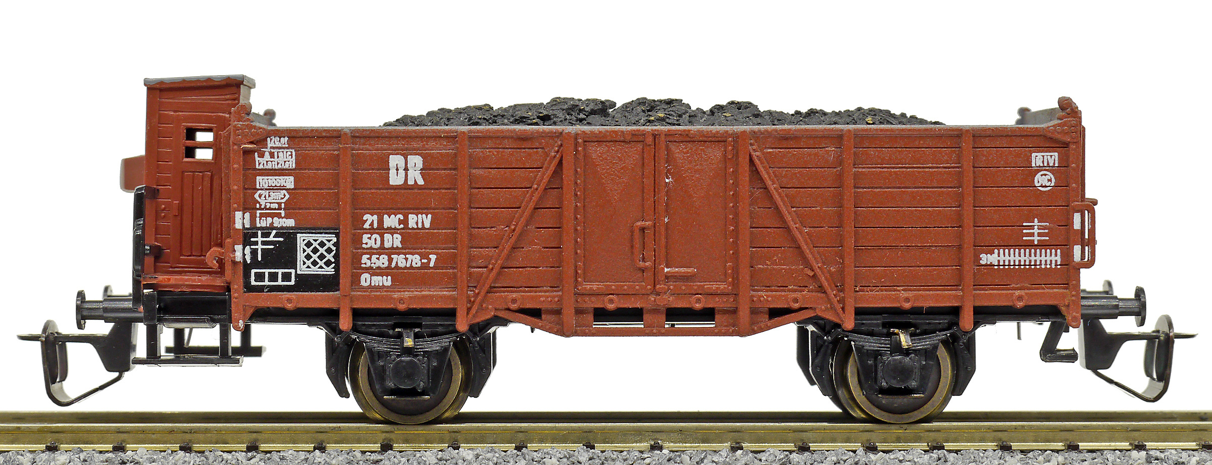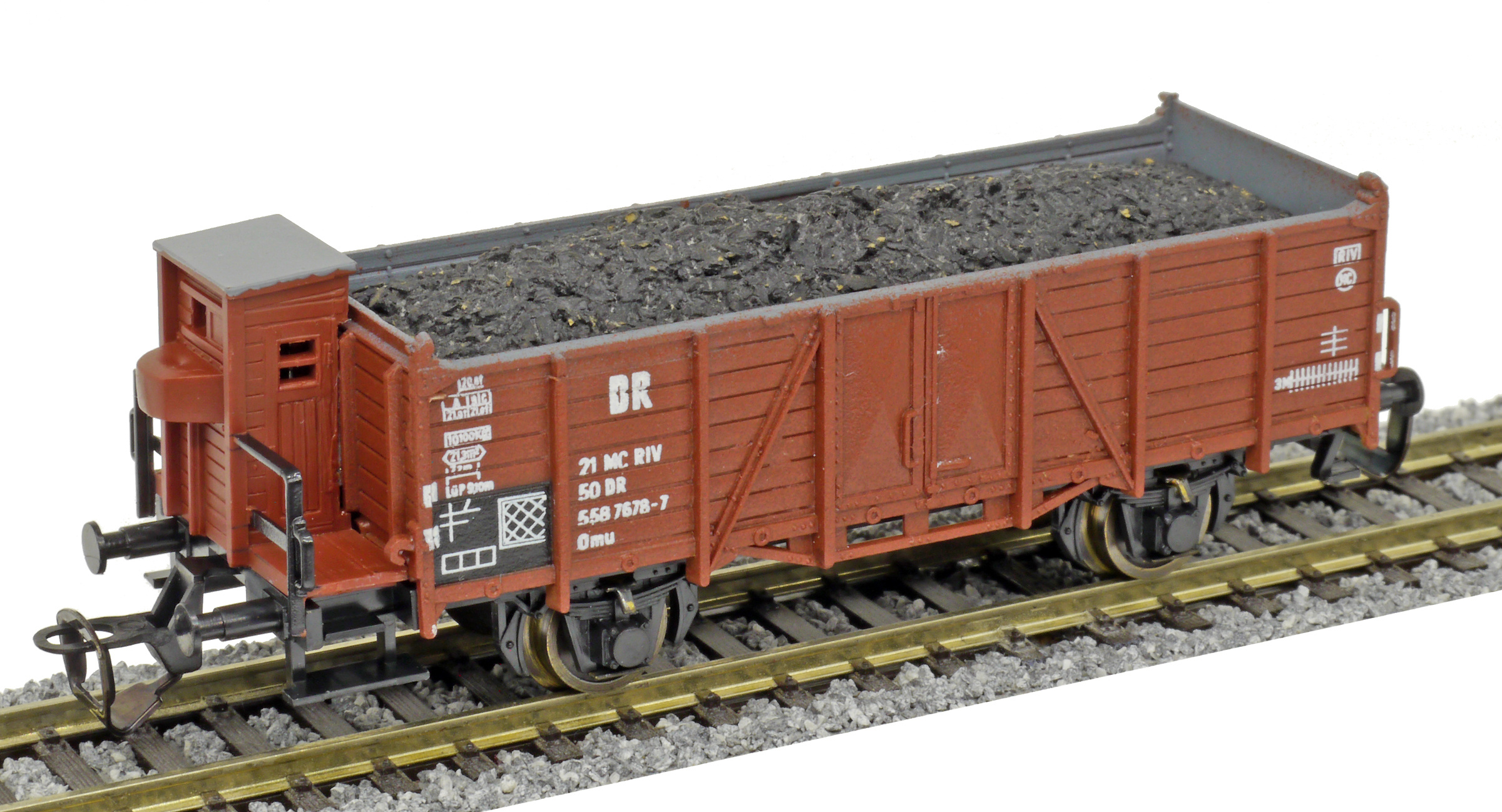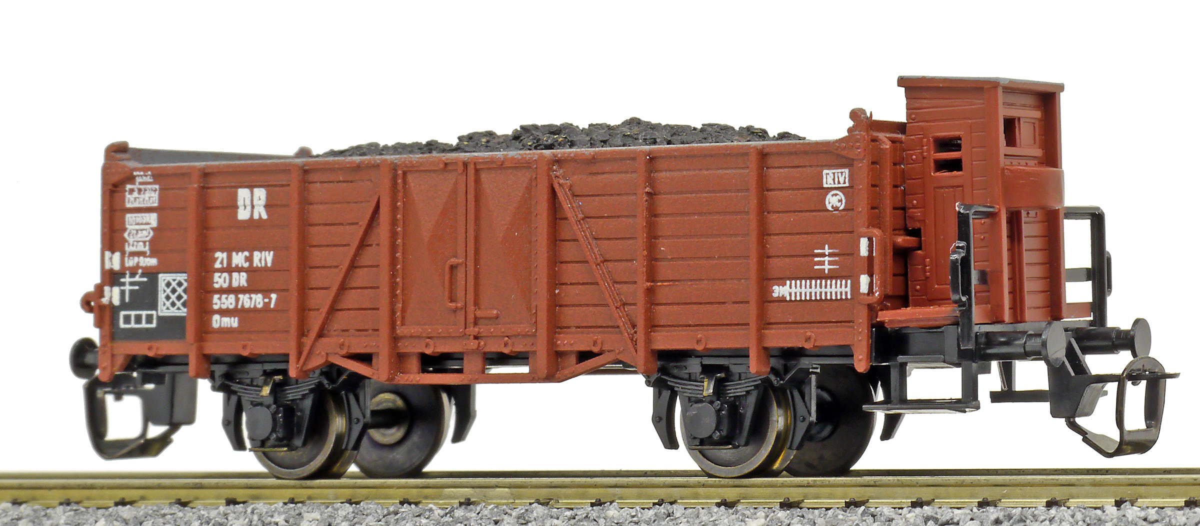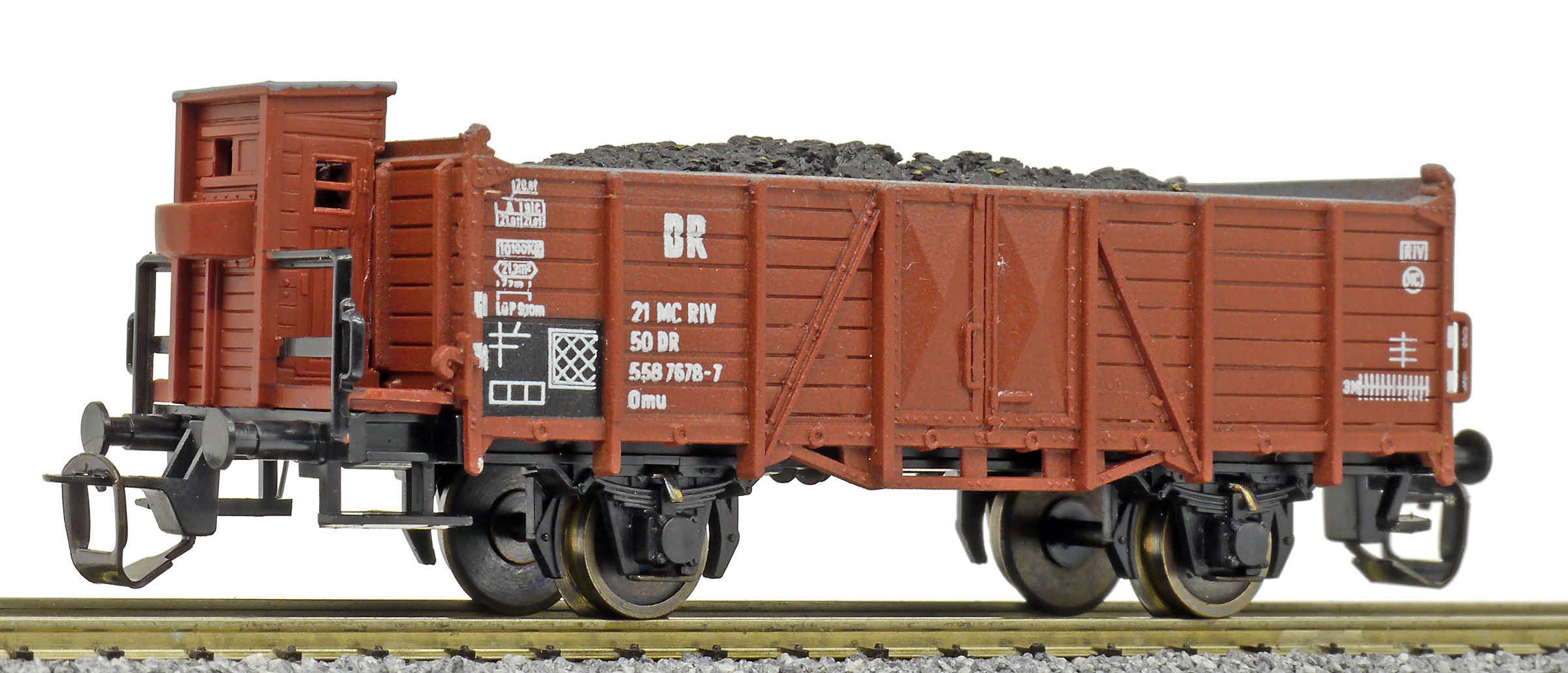 | otevřený nákladní vůz červenohnědý s brzdařskou budkou a nákladem uhlí |