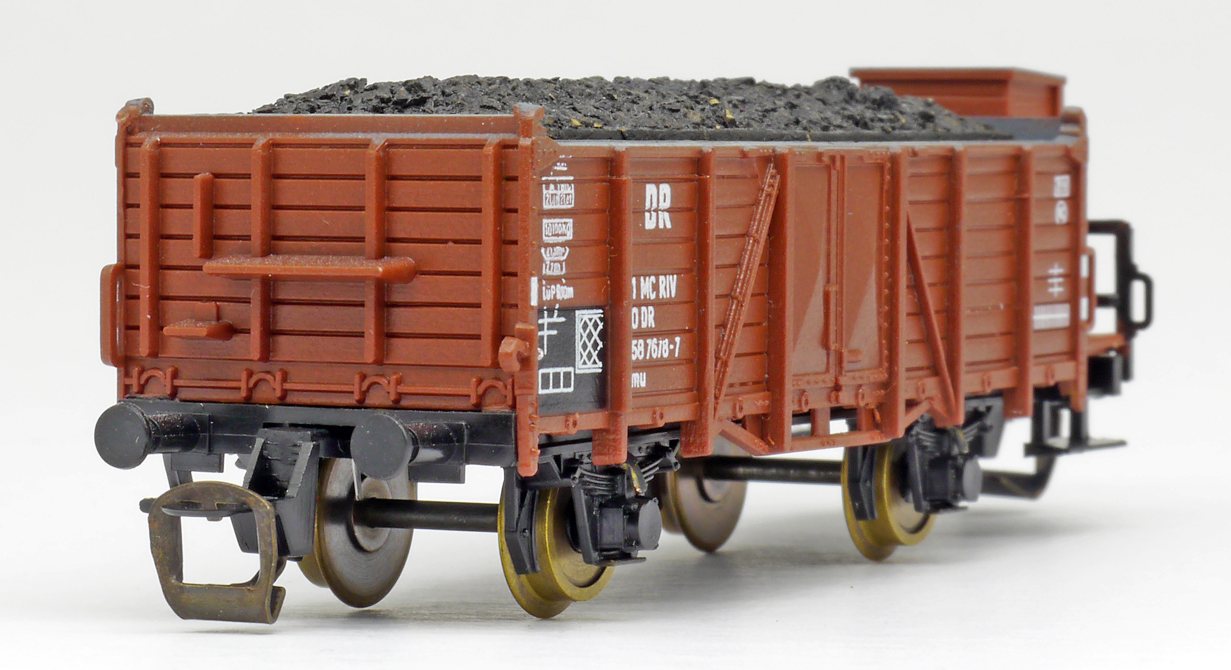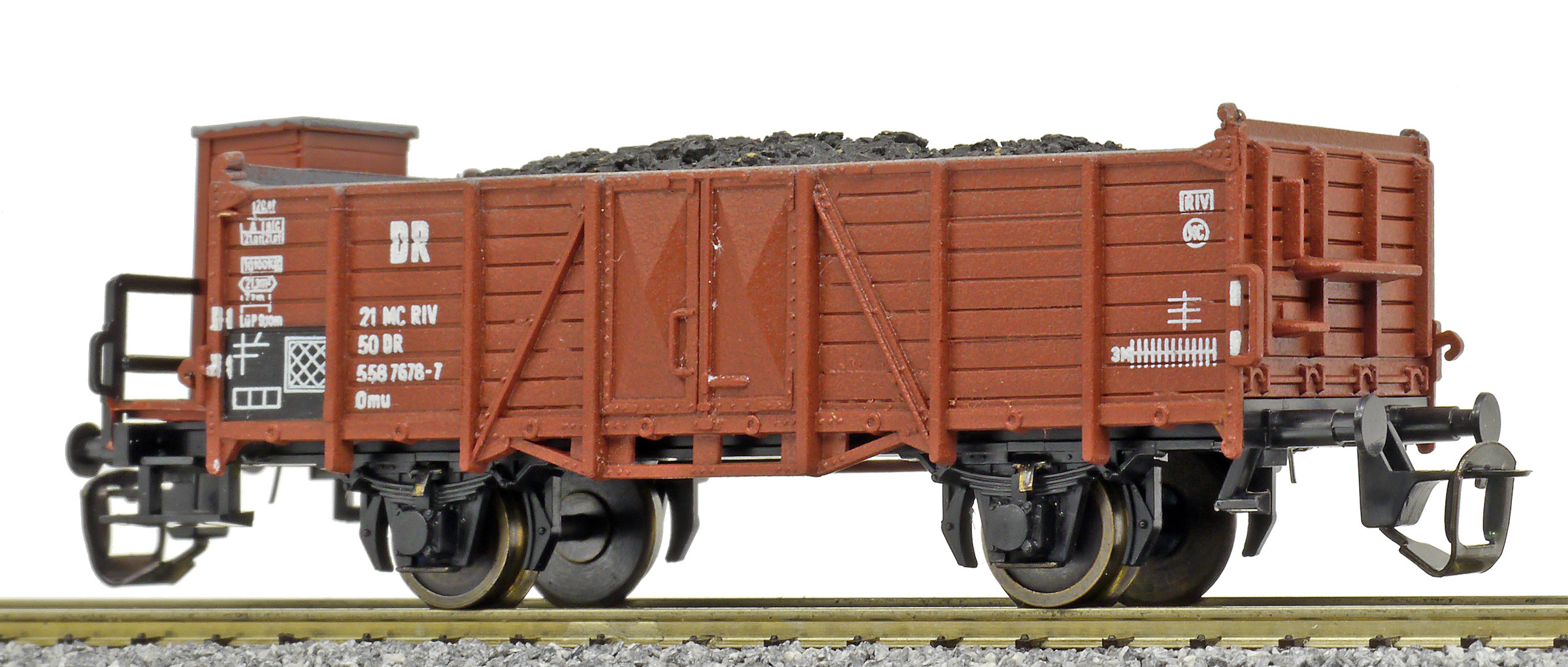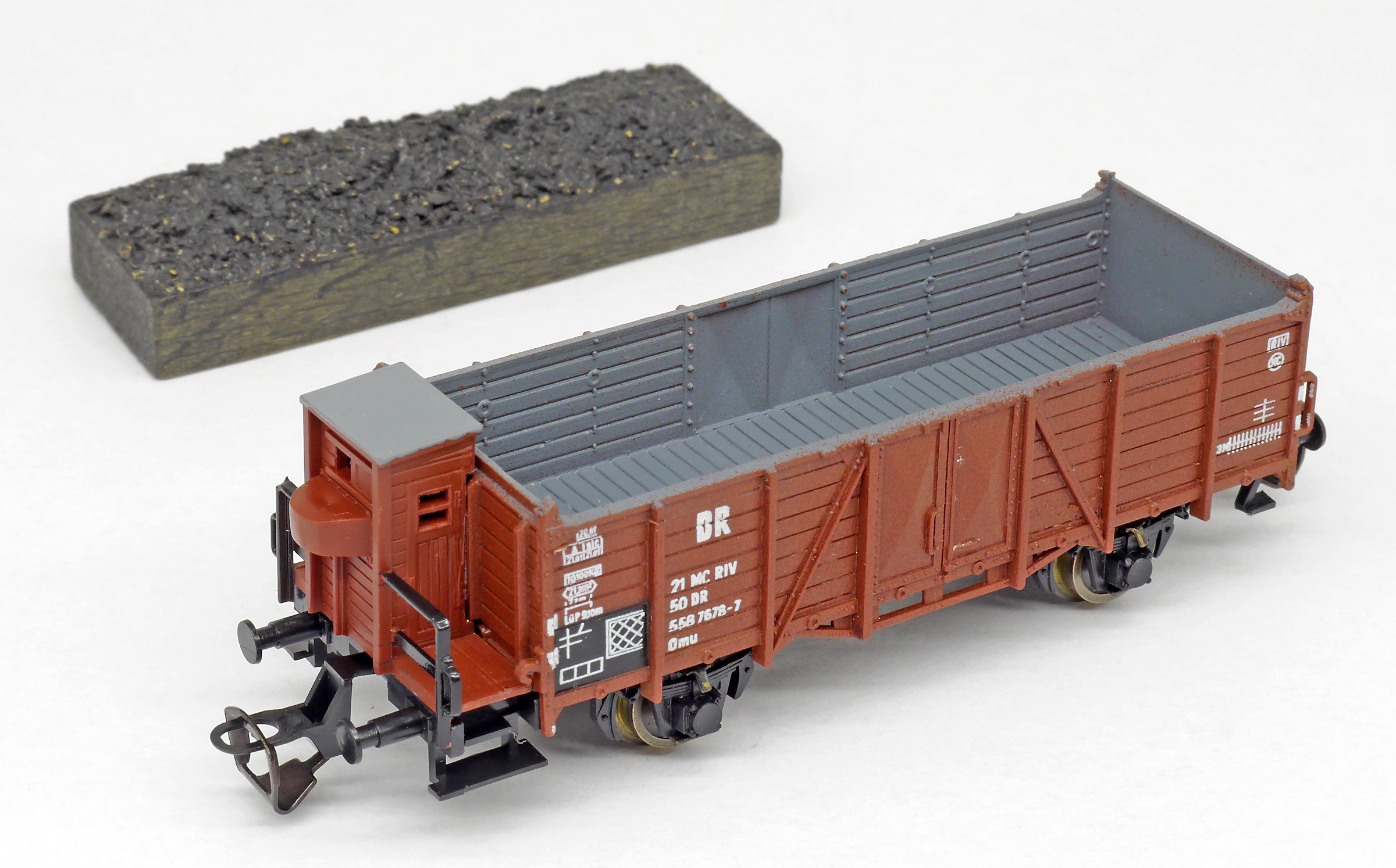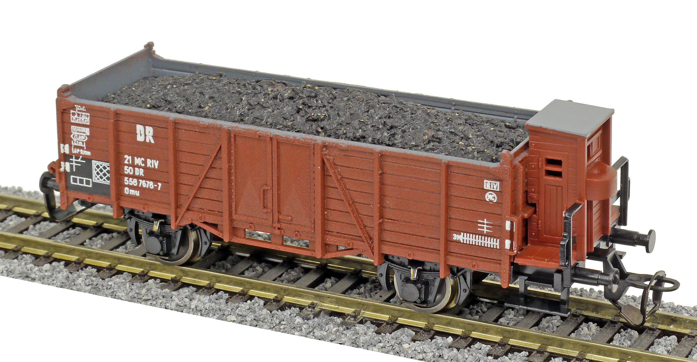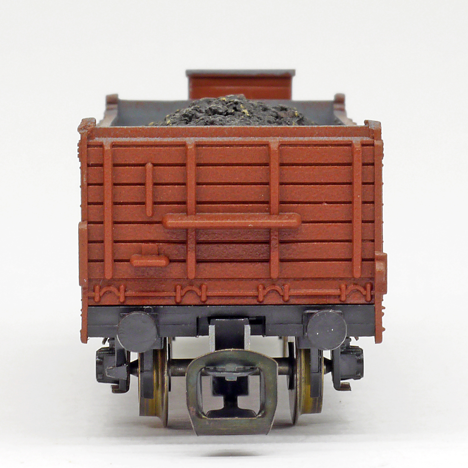 | otevřený nákladní vůz červenohnědý s brzdařskou budkou a nákladem uhlí |