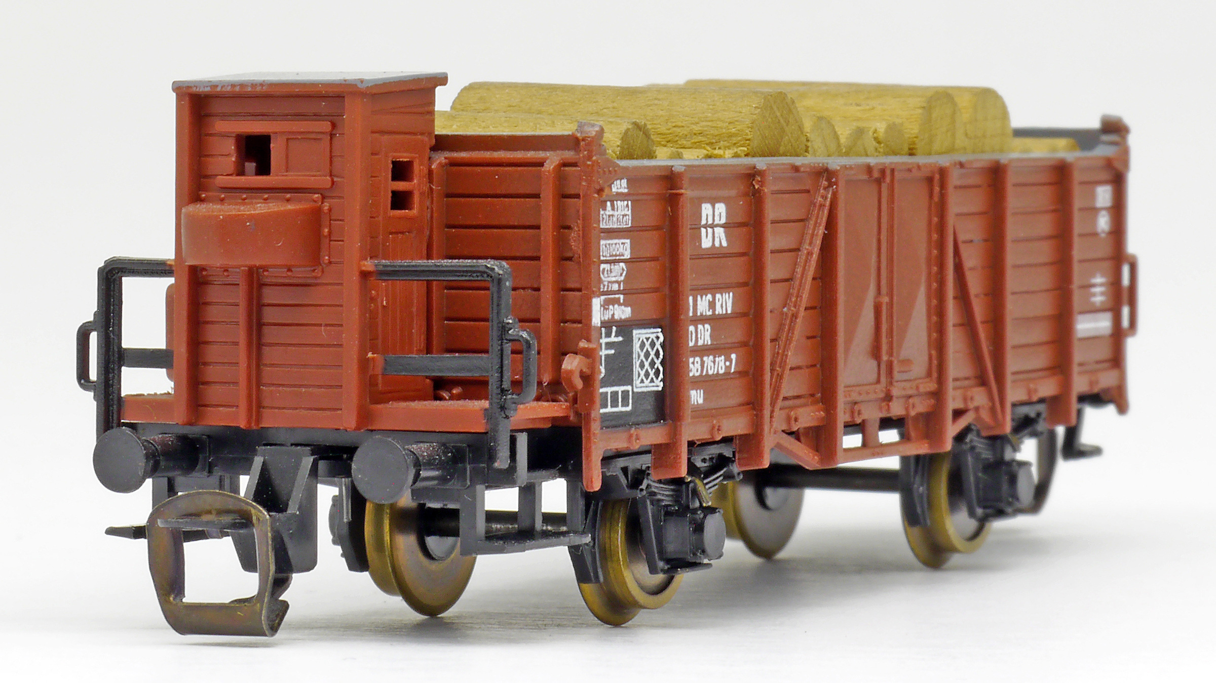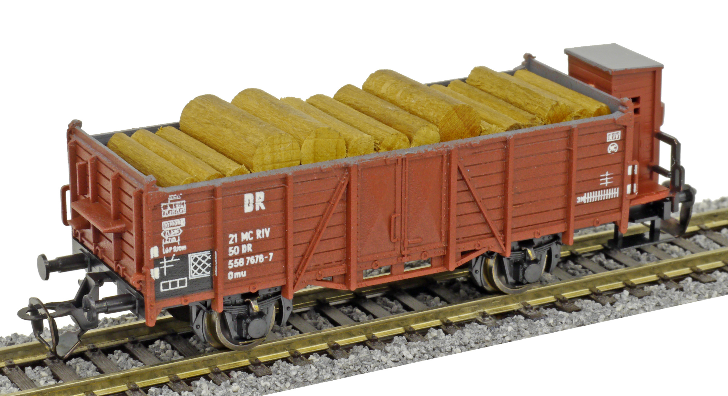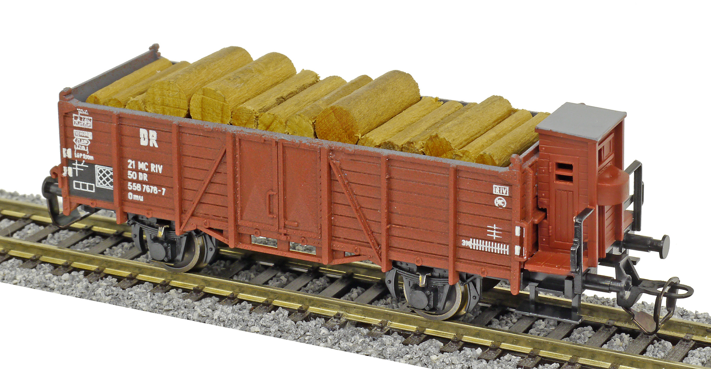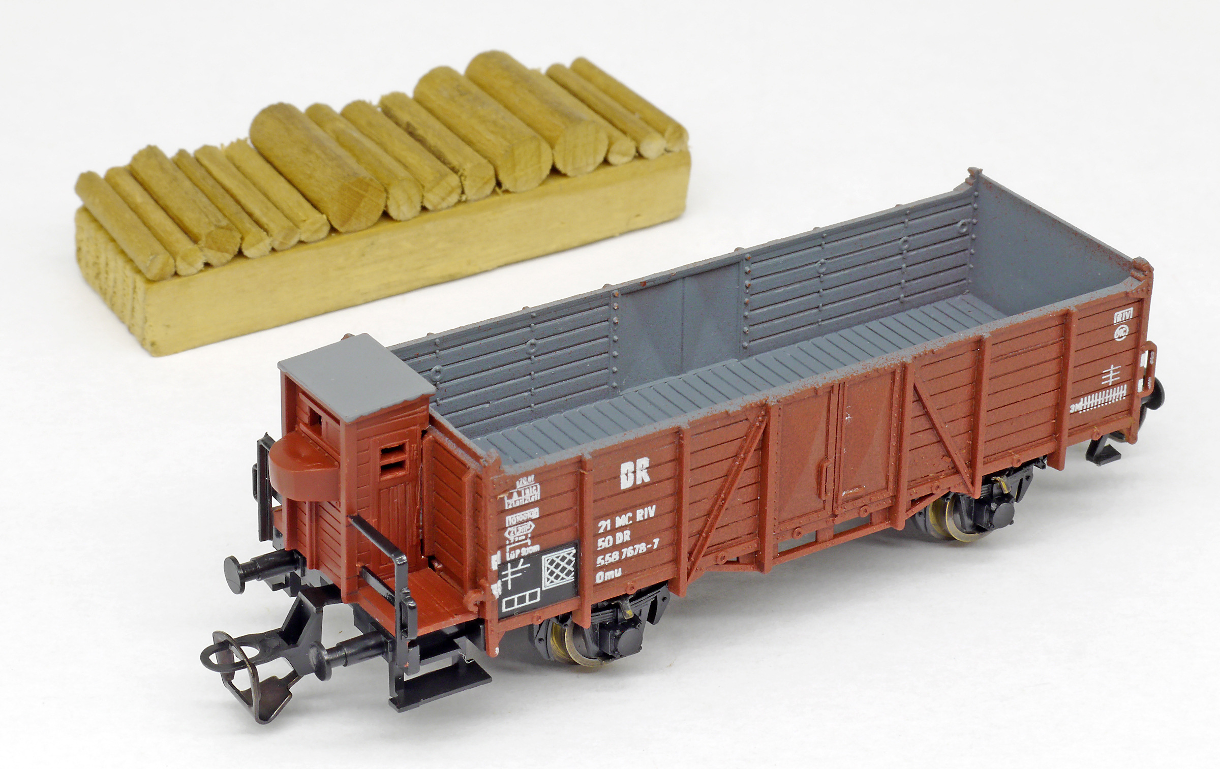 | otevřený nákladní vůz červenohnědý s brzdařskou budkou a nákladem kulatiny |