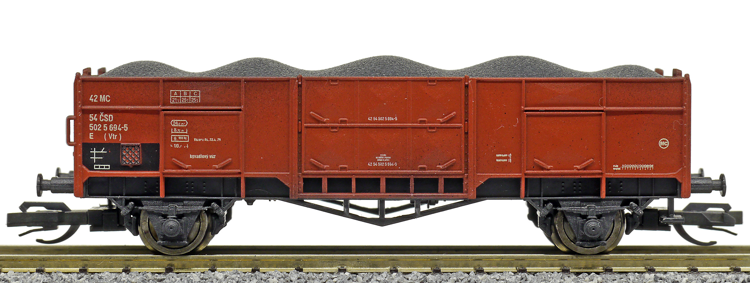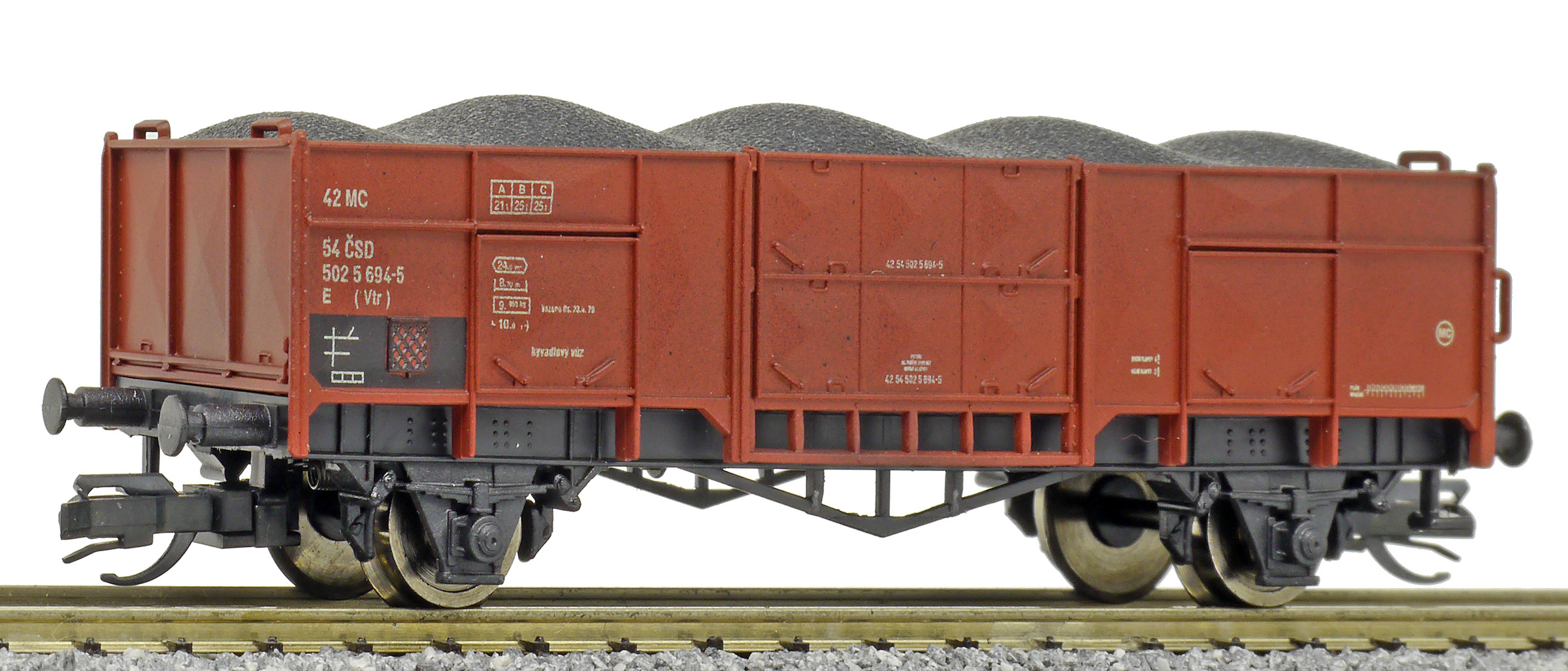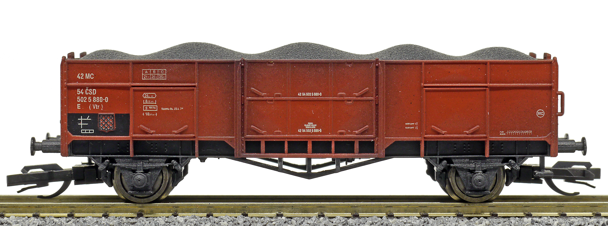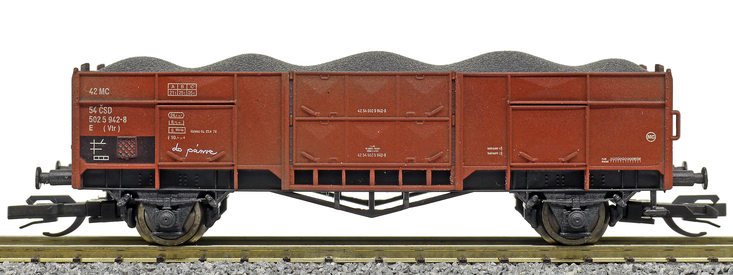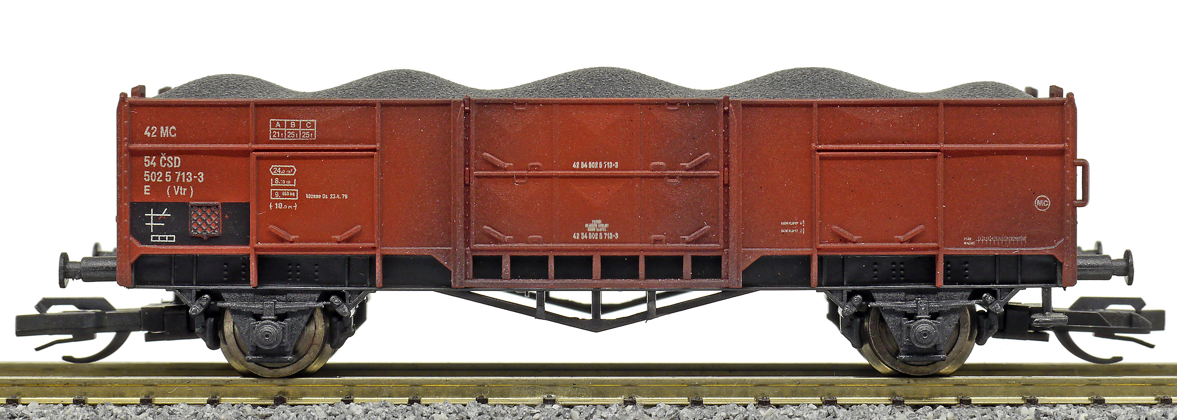 | otevřený nákladní vůz červenohnědý s nákladem, přetisky čísla vozu |